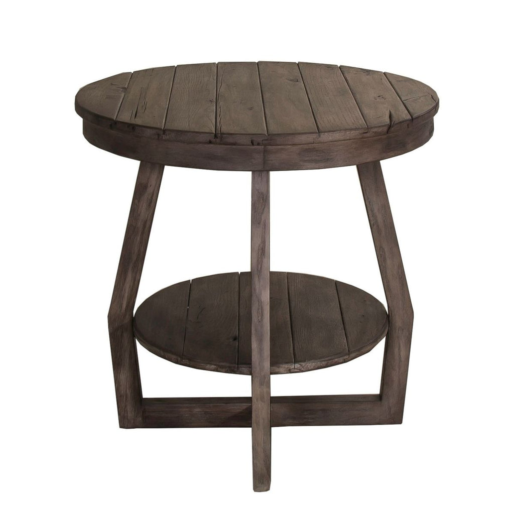 Liberty Furniture Hayden Way End Table in Gray 41-OT1020. Accent your space with the urban living Hayden Way end table. Crafted of poplar solids, this piece features a gray wash finish with steel brush distressing, appealing planked top, reclaimed wood, bottom shelf for additional storage, anchored by a unique angled intersecting base design. This casually designed end table would make a wonderful addition to any rustic or contemporary home.