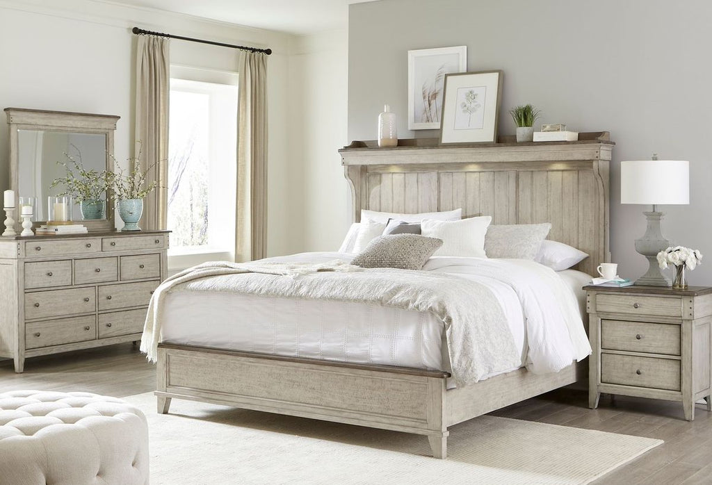 Liberty Furniture Ivy Hollow 3 Drawer Nightstand w/ Charging Station in Weathered Linen 457-BR61. Live life beautifully with the Ivy Hollow three-drawer nightstand with charging station. Crafted of poplar solids with pine and alder veneers, this piece features dusty taupe tops with a weathered linen base that is heavily distressed with saw marks. The three drawers offer plenty of storage with the top drawer offset to add dimension and being lined in premium felt and the bottom drawer lined with cedar. Pin nail accents and antique pewter knob hardware add character to the front of the case. Place this nightstand next to your bed and take advantage of the built-in charging station, complete with two electrical outlets and two USB ports. Inviting and inspirational, Ivy Hollow offers a look and design style that works for cottage or contemporary and is more about creating a look that we love.