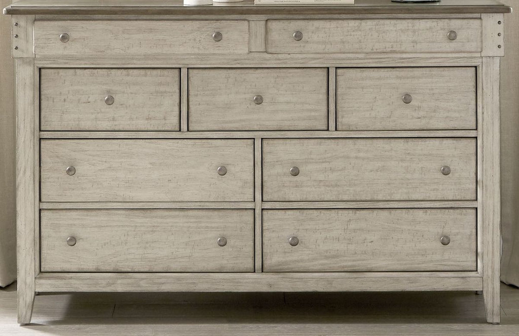 Liberty Furniture Ivy Hollow 9 Drawer Dresser in Weathered Linen 457-BR31. Live life beautifully with the Ivy Hollow dresser. Crafted of poplar solids with pine and alder veneers, this piece features dusty taupe tops with a weathered linen base that is heavily distressed with saw marks. This dresser offers nine full extension drawers with premium felt lined top and cedar lined bottom drawers. The top drawers are offset for added dimension which flow into tapered feet. Framed end panels create a nice side view. Pin nail accents and antique pewter knob hardware add character to the front of the case. Inviting and inspirational, Ivy Hollow offers a look and design style that works for cottage or contemporary and is more about creating a look that we love.
