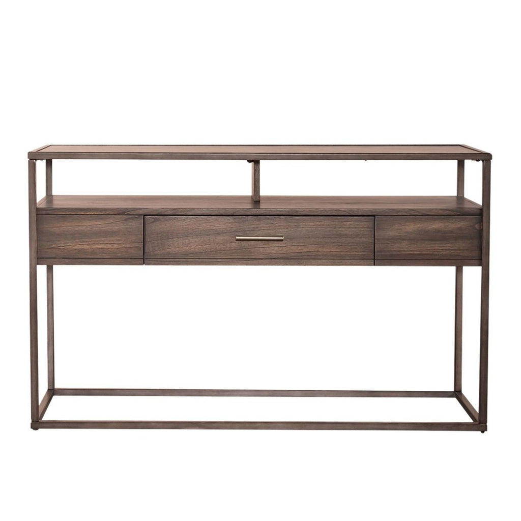 Liberty Furniture Jamestown Sofa Table in Brown 626-OT1030. Simplify your urban space with the Jamestown sofa table. Crafted of rubberwood solids, metal tubes and mindy veneers, this piece features a tobacco finish, one full extension drawer, and an open shelf for additional storage. This modern sofa table would make a great addition to your contemporary space.