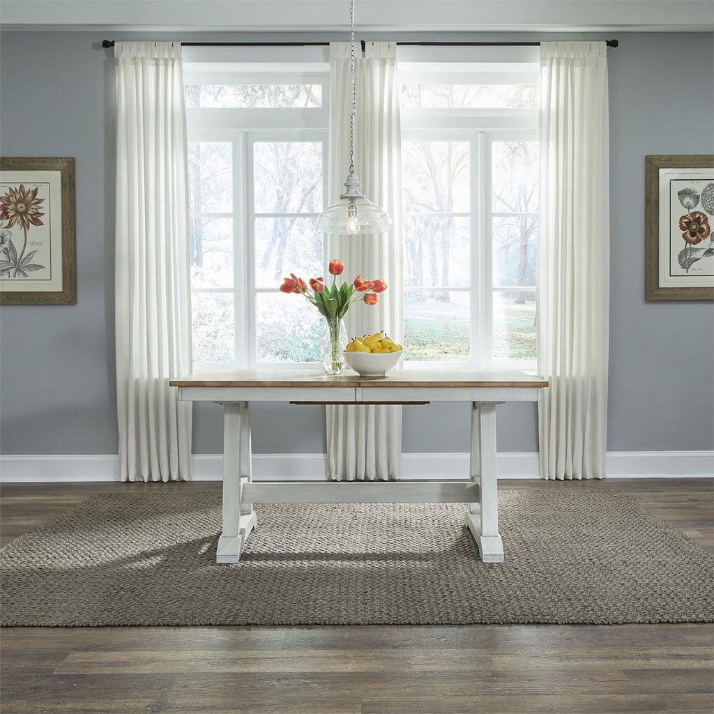 Liberty Furniture Lindsey Farm Trestle Dining Table in Weathered White & Sandstone. Vintage can refer to "a classic," add in a relaxed style and you create a classic look with a casual feel. Looks that easily work in today's homes style uncompromised with comfort abound.