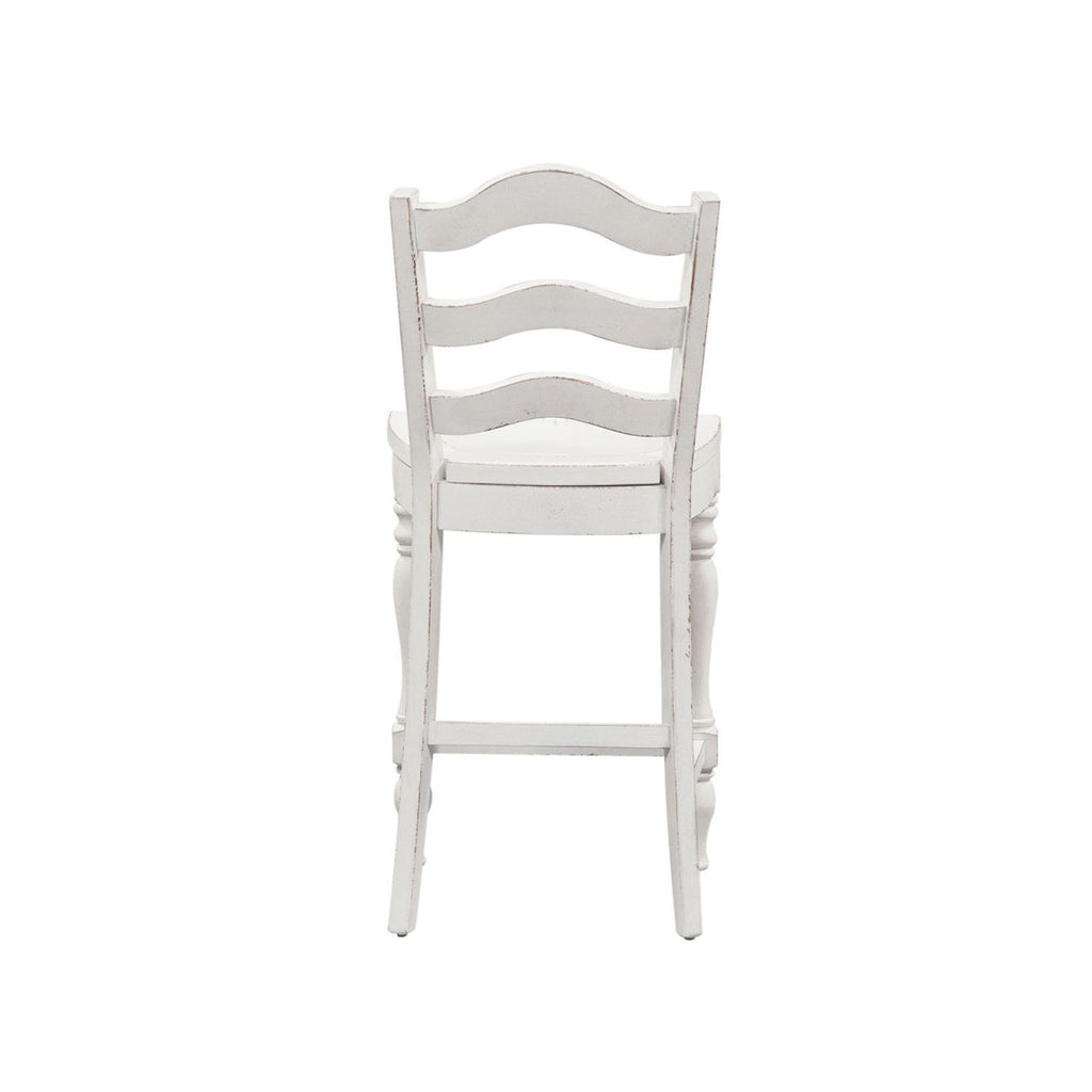 Liberty Furniture Magnolia Manor Ladder Back Counter Chair (Set of 2) in Antique White & Weathered Bark 244-B200024. Sit in comfort with the Magnolia Manor ladder back counter chair. Crafted of rubberwood solids, this piece features the perfect blend of European design, an arched ladderback and wooden saddle seat, nylon chair glides to protect your flooring, anchored by beautifully turned legs. Warm antique finishes and artistic distressing along with grand scale create a piece to be passed to generations.