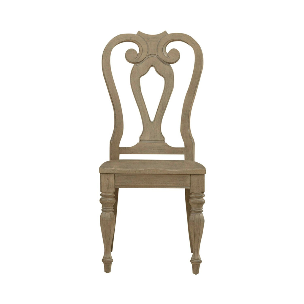 Liberty Furniture Magnolia Manor Splat Back Side Chair (RTA) (Set of 2) in Weathered Bisque 244N-C2500S. Sit and relax with the Magnolia Manor II splat back side chair. Crafted with excellence using Poplar solids, this chair features a Weathered Bisque finish. The chairback offers beautiful shaping and dog bone accents. The saddle shaped seat adds for comfort and the faceted turned legs have nylon chair glides to protect your flooring. The blending of European influences in the Magnolia Manor II splat back side chair makes for a truly unique style for any living space.