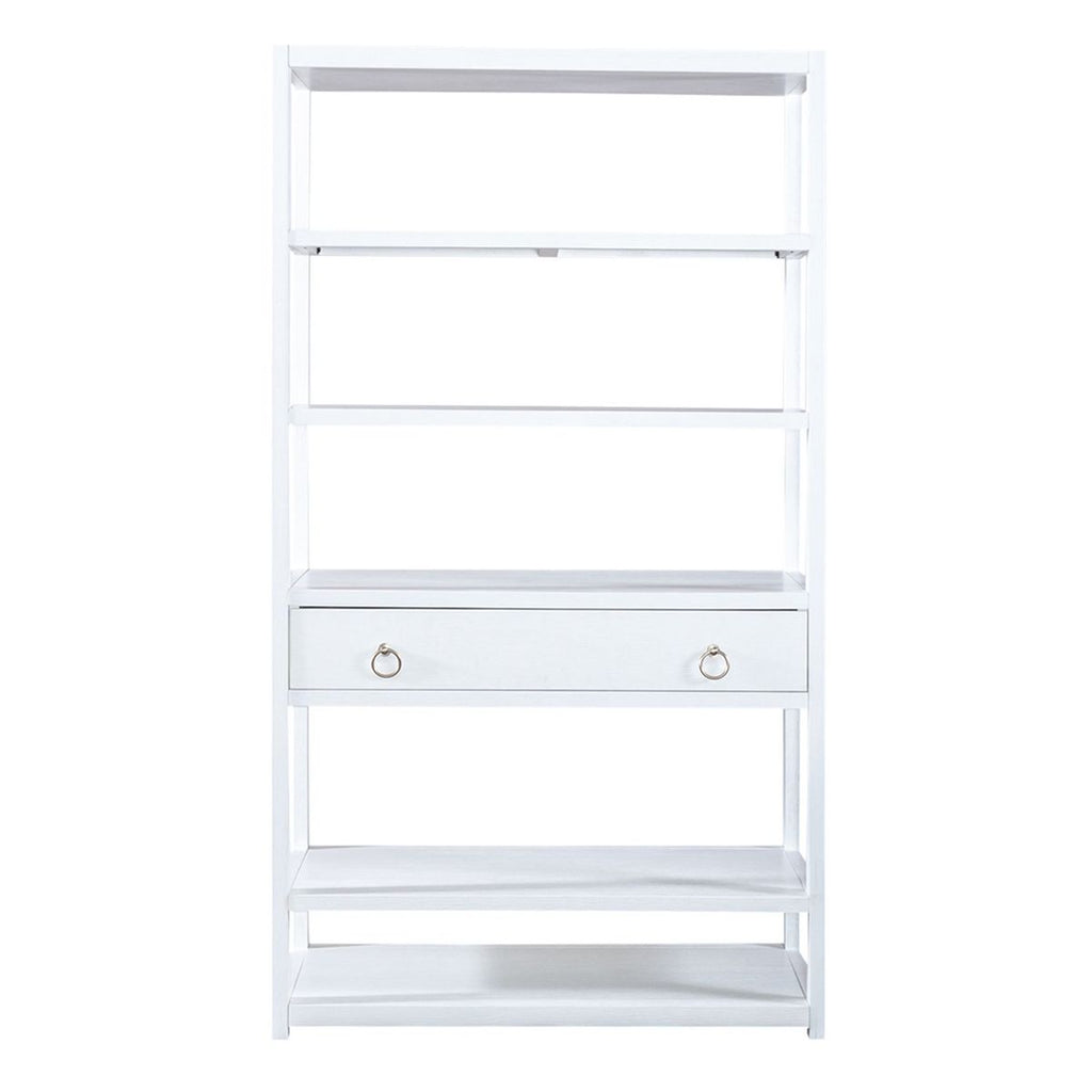 Liberty Furniture Midnight Accent Bookcase in Wire Brushed Denim 2030WH-AB3970. Turn your house into a home with the eclectic East End accent bookcase. Crafted of Acacia Solids and veneers, this piece features a wire brushed white finish accented with brass ring hardware. This bookshelf offers six shelves for storage and display as well as a full extension drawer for additional storage. This piece is versatile enough to work in any room and transform the ordinary into the extraordinary. Unique and timeless, allow the East End accent bookcase to bring inspirational design into your home.