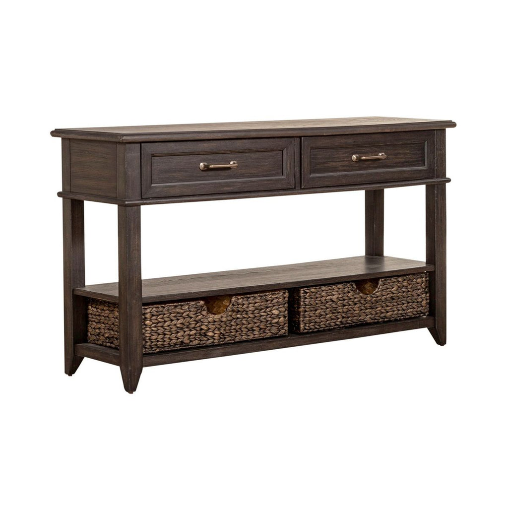 Liberty Furniture Mill Creek 2 Drawer Sofa Table in Peppercorn 792-OT1030. Designed to last throughout the years, the Mill Creek two drawer sofa table will delight generations to come. Crafted with excellence using rubberwood solids and split heart white oak veneers, this piece features a Peppercorn finish. There are two full extension drawers with wood framed drawer fronts that are accented with Burnished Brass bar pull hardware. The beveled edge of the drawer fronts add visual interest. Use the two open bottom shelves for storage or display, complete with two Sea Grass Rope baskets. Bead molding runs along the center of the table to give it a distinct style and block legs flow into tapered feet to catch the eye. The Mill Creek two drawer sofa table offers lots of function in a classic, timeless design.