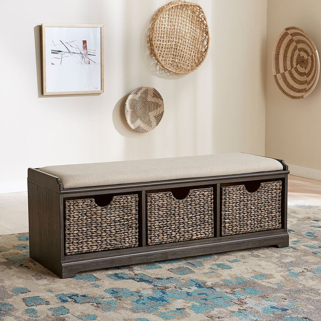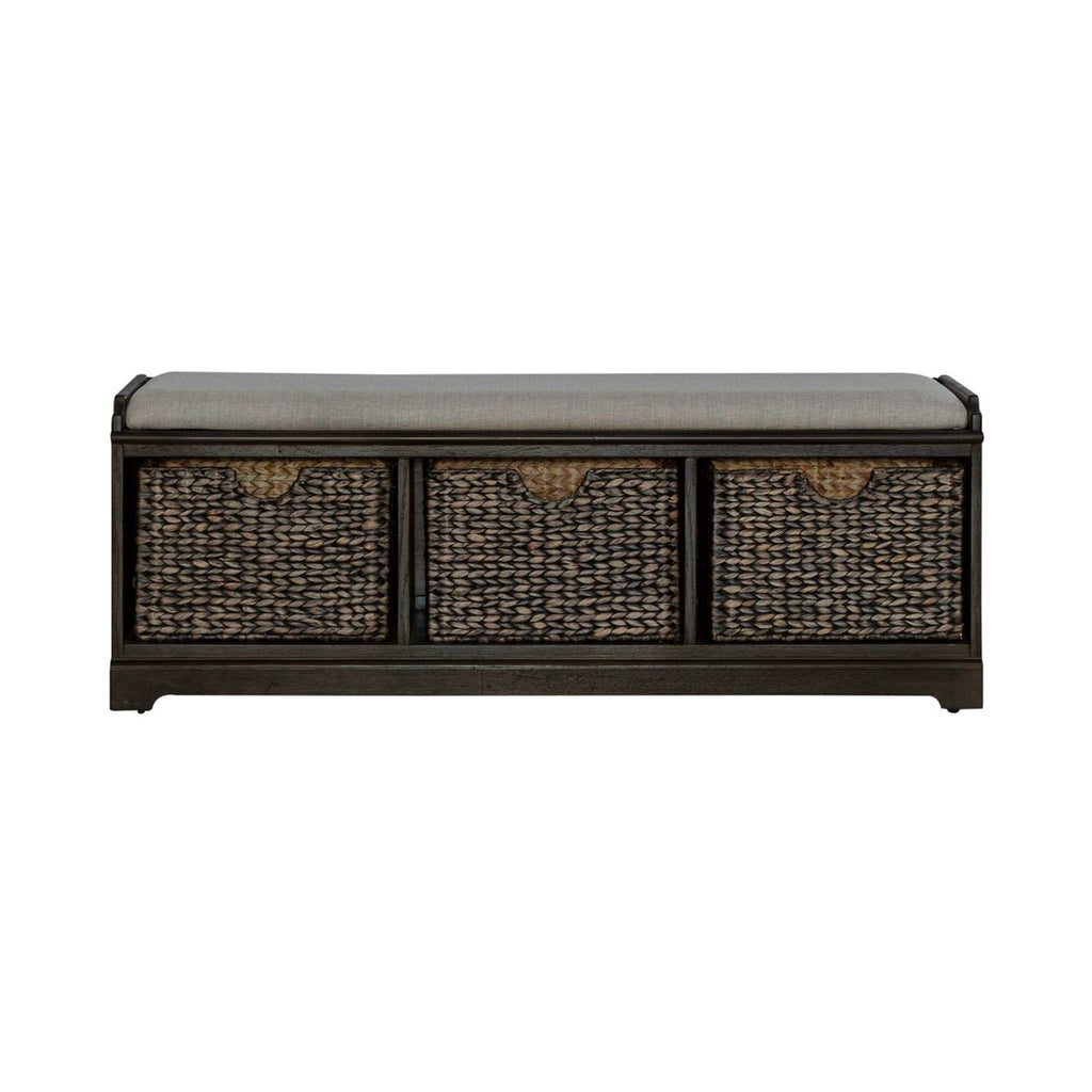 Liberty Furniture Mill Creek Wall Bench in Peppercorn 792-OT2000. Designed to last throughout the years, the Mill Creek wall bench will delight generations to come. Crafted with excellence using rubberwood solids and split heart white oak veneers, this piece features a Peppercorn finish. This is the perfect addition to your mud room or hallway. The shaped gallery rail is a unique design element and showcases the padded seat upholstered in Cream Linen, offering a comfy place to put on your shoes in the morning or to take a break. The open bottom storage compartment includes three Sea Grass Rope baskets to tuck away shoes or other small items. The Mill Creek wall bench offers comfort and function in a classic, timeless design.