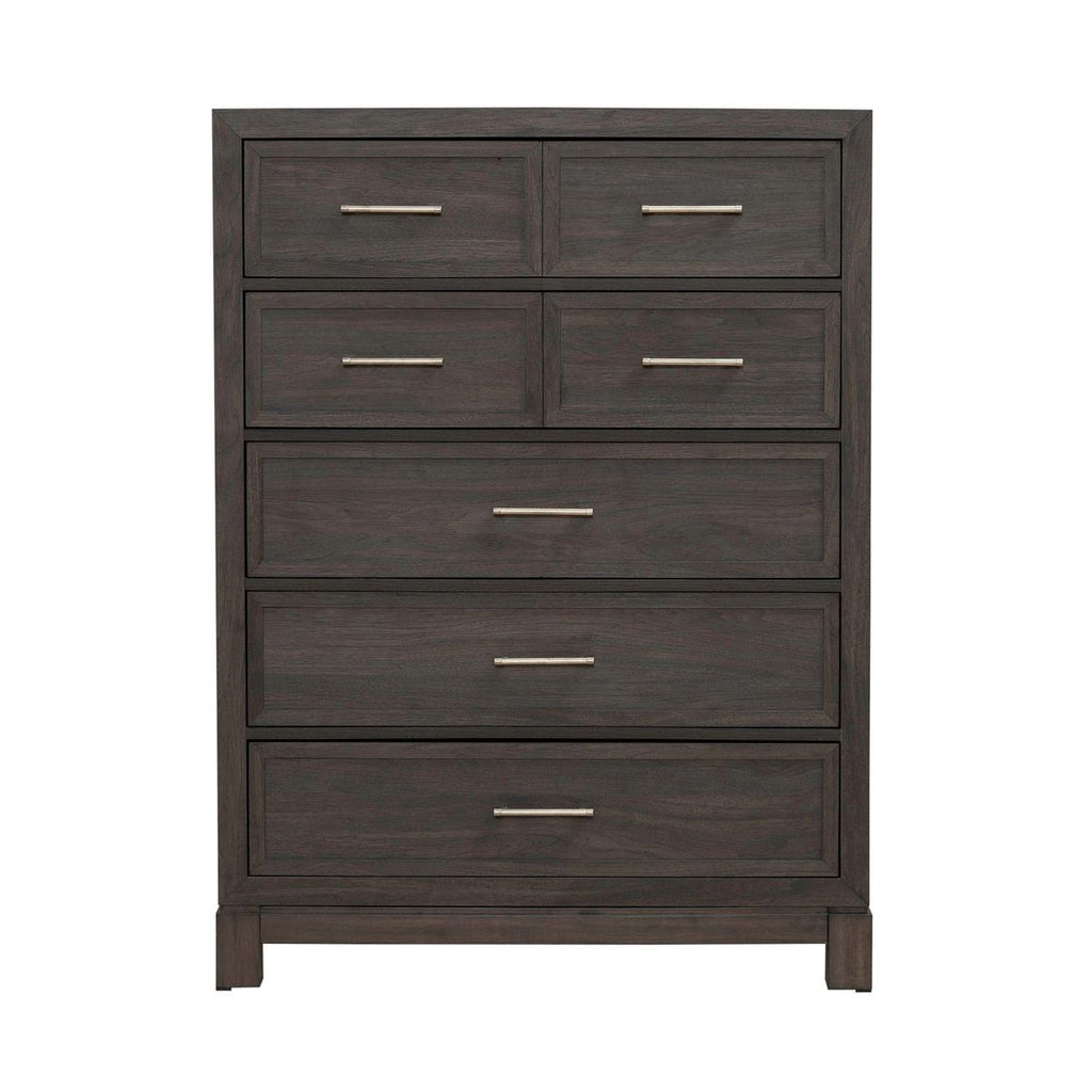 Liberty Furniture Modern Edge 5 Drawer Chest in Caffe 313-BR41. Create a room of your own that provides the perfect start and end to each day with the Modern Edge 5 drawer chest. Meticulously crafted using Rubberwood solids and Melamine, this chest features a Caffe finish. The chest boasts wide picture frame molding and a distinguished raised block base, exuding timeless charm and sophistication. Each drawer front is wood framed, accentuating the craftsmanship and adding a touch of elegance to the piece. Adorned with Satin Wash bar pull hardware, the drawers offer both ease of use and visual appeal. The top two drawers feature a unique design element: moldings that create the illusion of two separate drawers while still providing deep storage space within each. This clever detail adds visual interest and enhances the chest's versatility, allowing for efficient organization without compromising on style. Whether you're storing clothing, linens, or personal belongings, the Modern Edge 5 drawer chest offers ample storage capacity while elevating the aesthetic of your bedroom. With its impeccable design and thoughtful details, it's sure to become a cherished piece in your home for years to come.