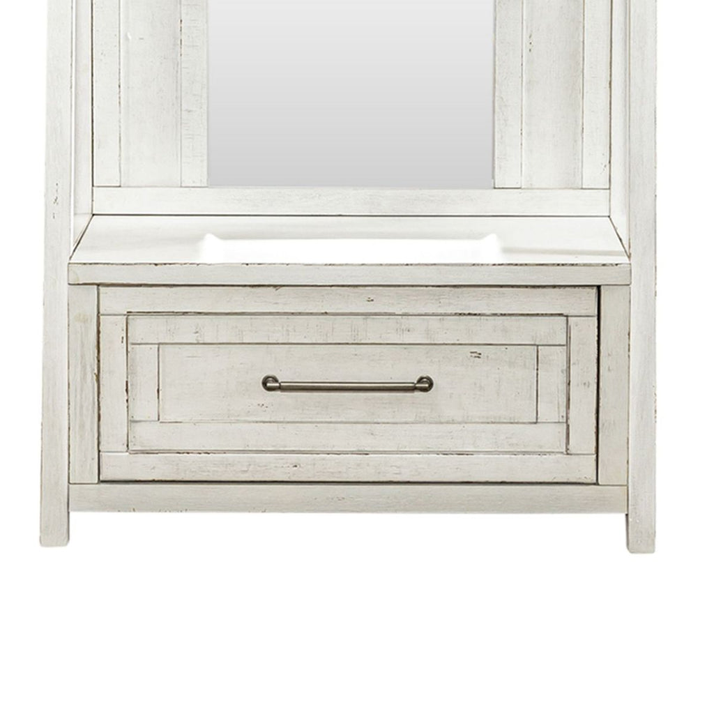 Liberty Furniture Modern Farmhouse Hall Tree in White. Crafted of poplar solid with knotty white oak veneers in a flea market white l finish. Features large full extension drawer to store away your shoes, bar pull in wash brass finish and unique high low veneer pattern drawer front. Paired with the top to make a complete hall tree.
