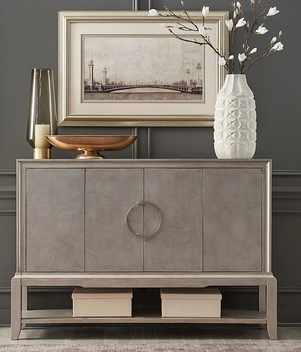 Liberty Furniture Montage 4 Door Server in Platinum 849-SR6645. Reinvent your style with the Montage server. Crafted of poplar solids with ash burl veneers, this piece features a platinum finish with oversized brushed nickel center circular hardware with touch latch doors. Storage abounds with one adjustable shelf behind the center two doors, and two adjustable shelves behind each side door. There is an open bottom shelf for additional storage or display items. The tapered legs and offset apron continue to add character to this piece. The Montage server brings a feeling of luxe living highlighted by a design that conveys luxury and sophistication.