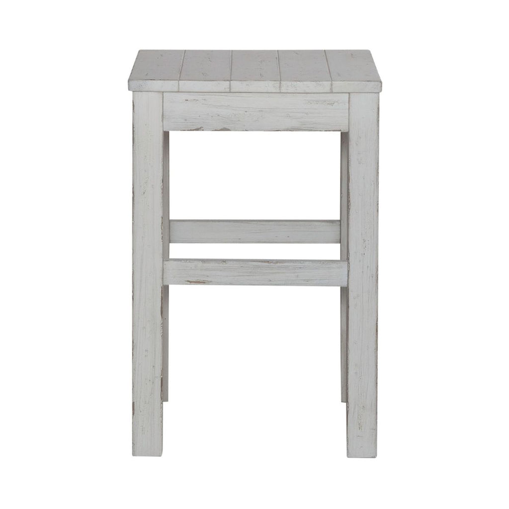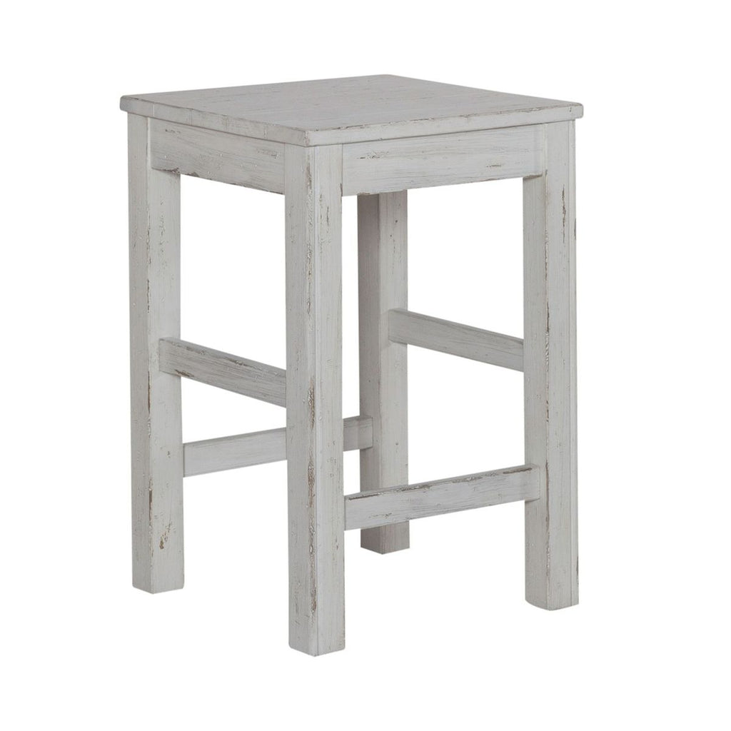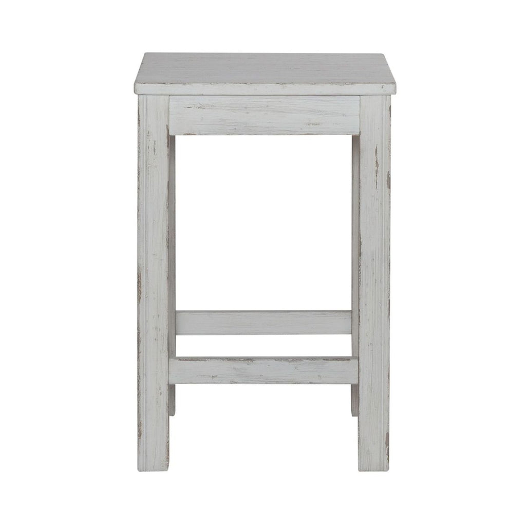 Liberty Furniture River Place Console Stool in Riverstone White & Tobacco 237-OT9000. Create a calm and peaceful oasis with the River Place console stool. Crafted with Pine solids, this piece features a heavily distressed Riverstone White finish. The seat of the stool is planked and combined with the square block legs which feature nylon chair glides to protect your flooring, creates an inviting and airy atmosphere in your home. The River Place console stool strikes the perfect balance of life on the coast and a comfy home tucked away in the hills.