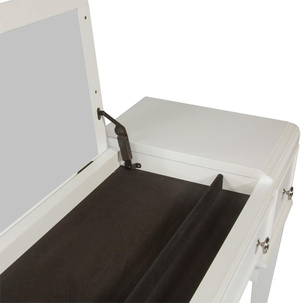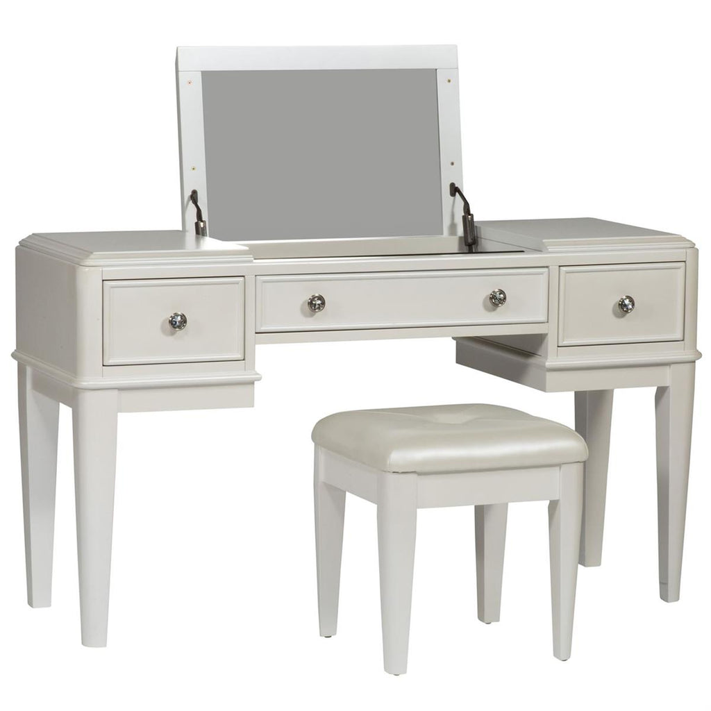 Liberty Furniture Stardust Vanity Desk in Iridescent White 710-BR35. Perfect for any little girl who enjoys playing dress up this lift mirror vanity is the ideal piece for your home. Crafted from poplar solids this vanity carries an iridescent white finish that is accented by crystal knob hardware for a glamorous design. Rounded corners and tapered legs are paired with with bead mouldings for an elegant touch. The bench is sold separately.