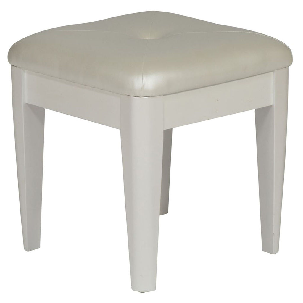 Liberty Furniture Stardust Vanity Stool in Iridescent White 710-BR48. A simple silhouette and comfortable seat make this vanity bench a great accent for your child's vanity. Finished in an iridescent white color over poplar solids and MDP this piece will add a glamorous look. Pair with the coordinating vanity for a complete set.