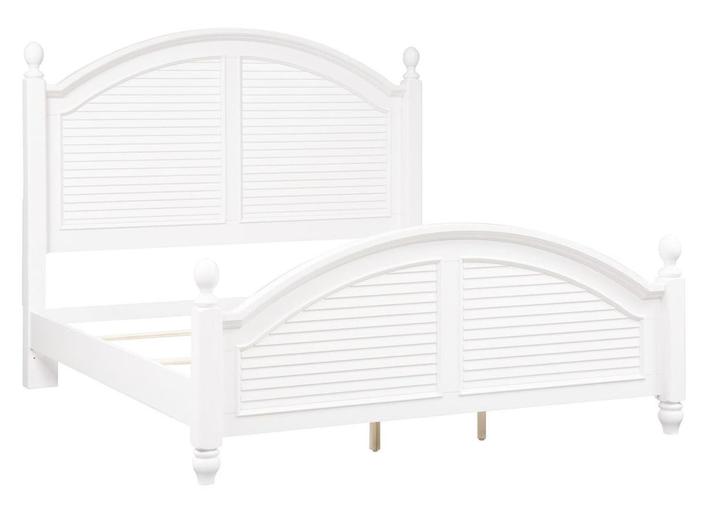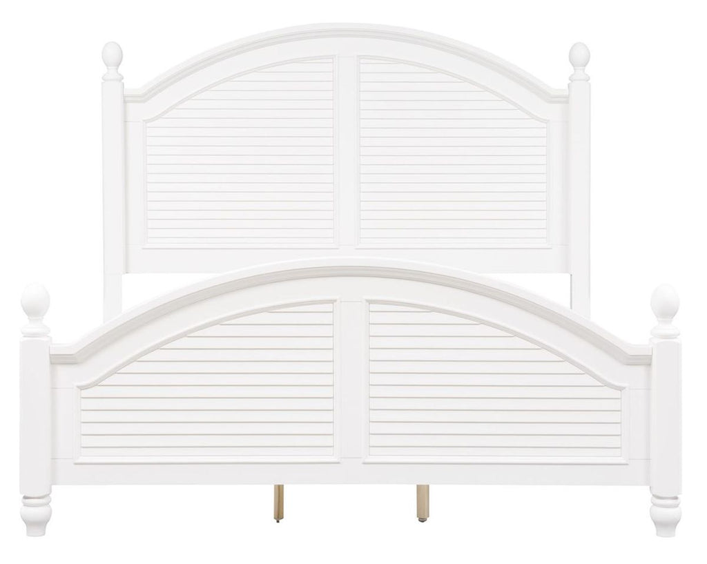 Liberty Furniture Summer House King Poster Bed in Oyster White 607-BR03. Brighten your home with this cozy cottage style bedroom collection. A painted oyster white finish over poplar and pine solids highlights the many details that each piece carries. Louvered accent panels, arched crown mouldings, and bead moulding framed drawers and doors create an eye-catching look. Create a room that will fit your lifestyle with your choice of storage bed, poster bed or panel bed. Simple wooden knob hardware and rounded bun feet complete the warm design of this collection.