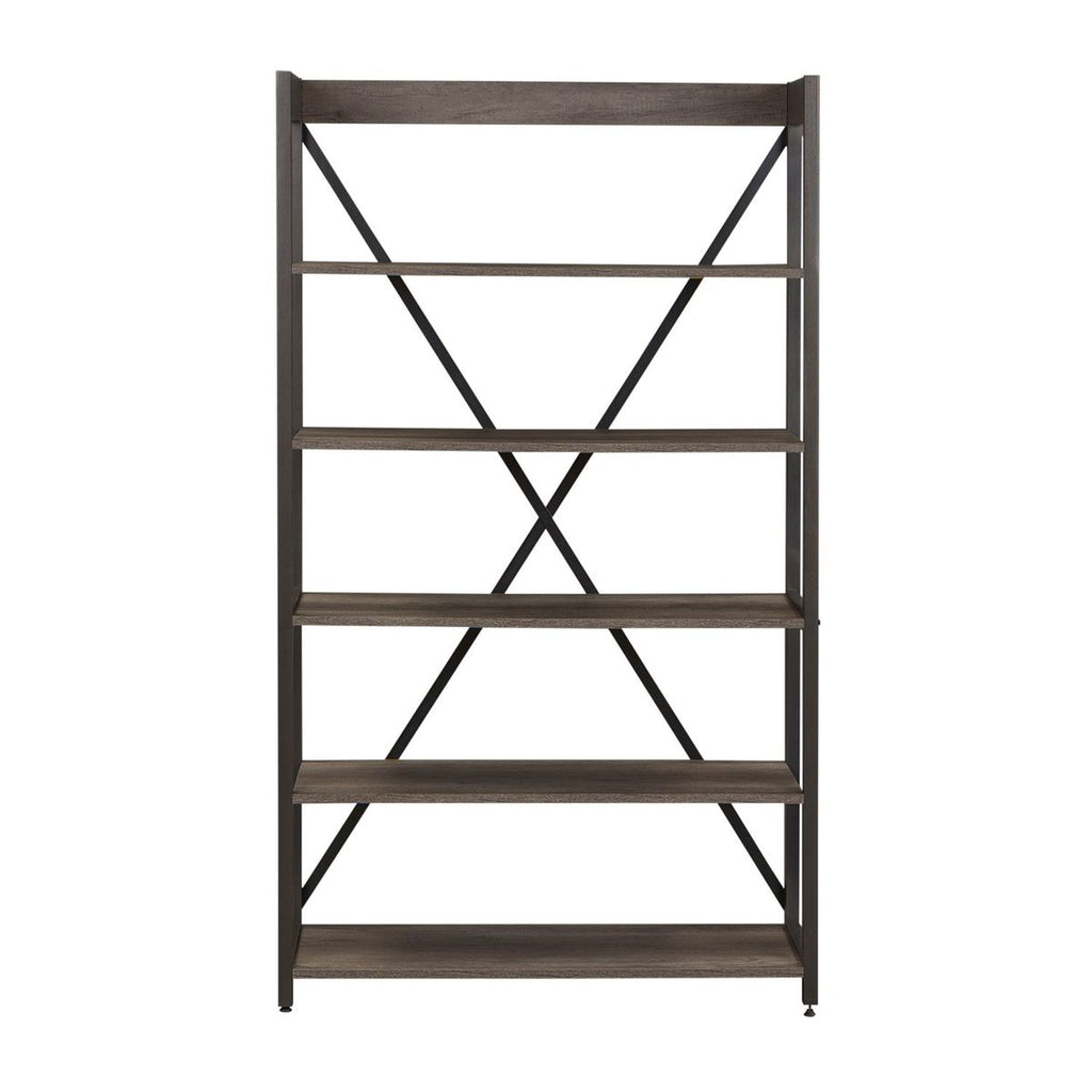 Liberty Furniture Tanners Creek Bookcase in Greystone 686-HO201. Create a natural feeling with the Tanners Creek 72" bookcase. Crafted with melamine and a rubberwood solid frame, this piece features a Greystone finish, open ends finished in a dark pewter metal, and floating shelf design. The five shelves and "X" accent on the back allow you to display your books and decorative accessories. The melamine is scratch resistant, sure to make this piece last in any office. Users have the option to pair this with the desk, or have this piece stand alone.