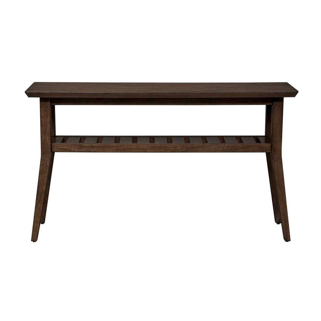 Liberty Furniture Ventura Blvd Sofa Table in Bronze 796-OT1030. Transform your space with the Ventura Boulevard sofa table. Crafted of rubberwood solids and cathedral walnut veneers, this piece features a bronze spice finish, bottom slat shelf for additional storage, anchored by tapered splayed legs. This contemporary sofa table would be a great addition to any space.