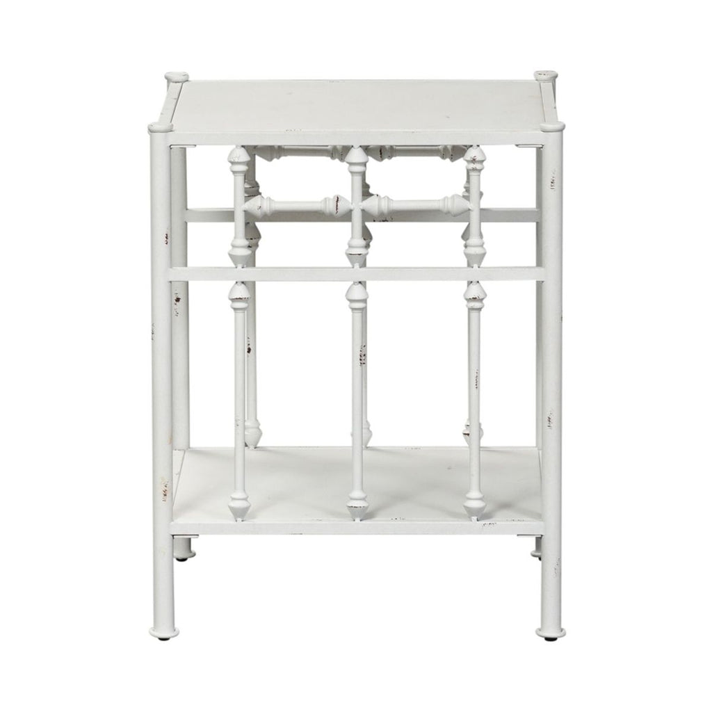 Liberty Furniture Vintage Series Open Nightstand in Antique White 179-BR61-AW. This industrial open night stand is the perfect way to enhance your room with a classic vintage style. The distressed metal finish paired with turned spindles create a truly unique look. This night stand comes in many color options, making it universal and adaptable to any space, while offering a unique designer look.