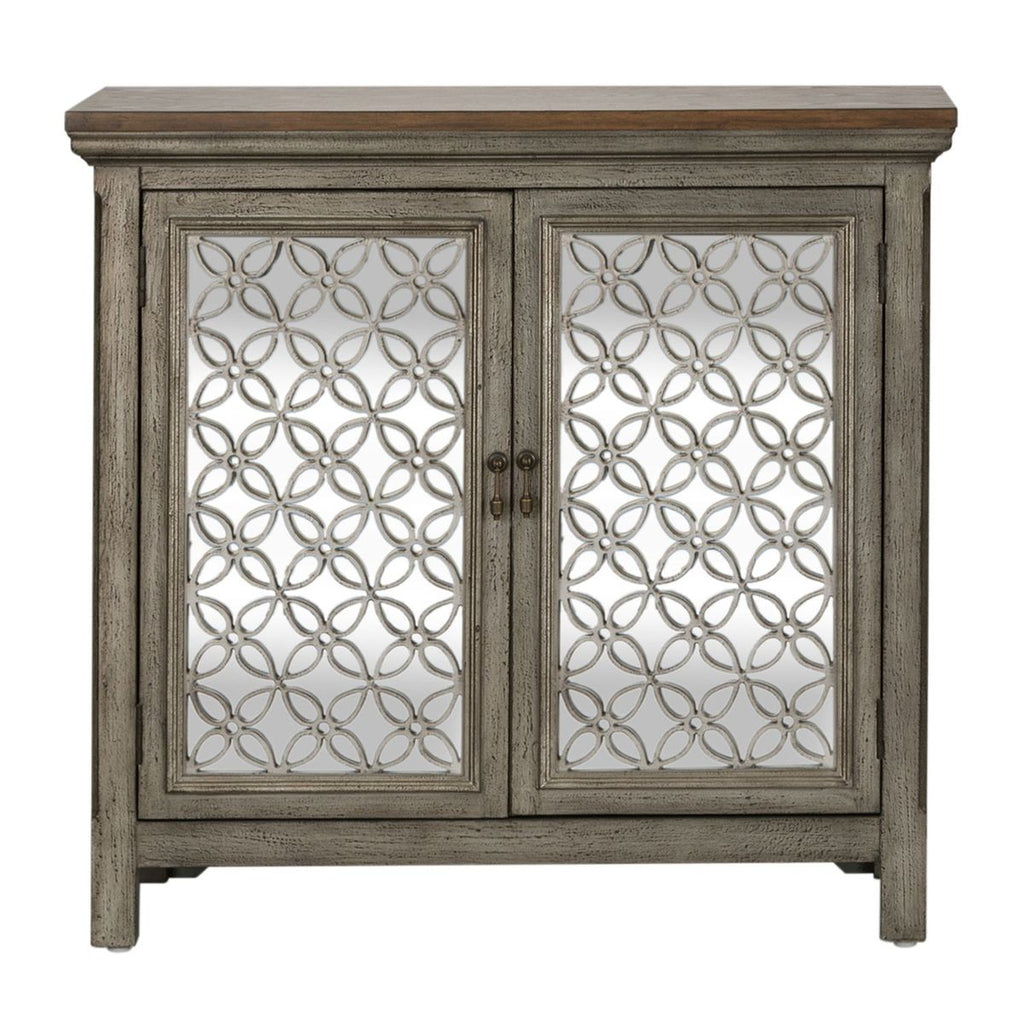 Liberty Furniture Westridge 2 Door Accent Cabinet in Wire Brushed Gray and White 2012-AC3836. Transform your home with the Westridge 38" accent cabinet. Crafted of Eucalyptus solids and Ash veneers in a wire brushed finished gray with white dusty wax and worn wood top. Features two mirrored doors with decorative floral pattern overlays, block feet and one concealed fixed shelf behind doors. A unique piece that will work with any decor from traditional to contemporary.