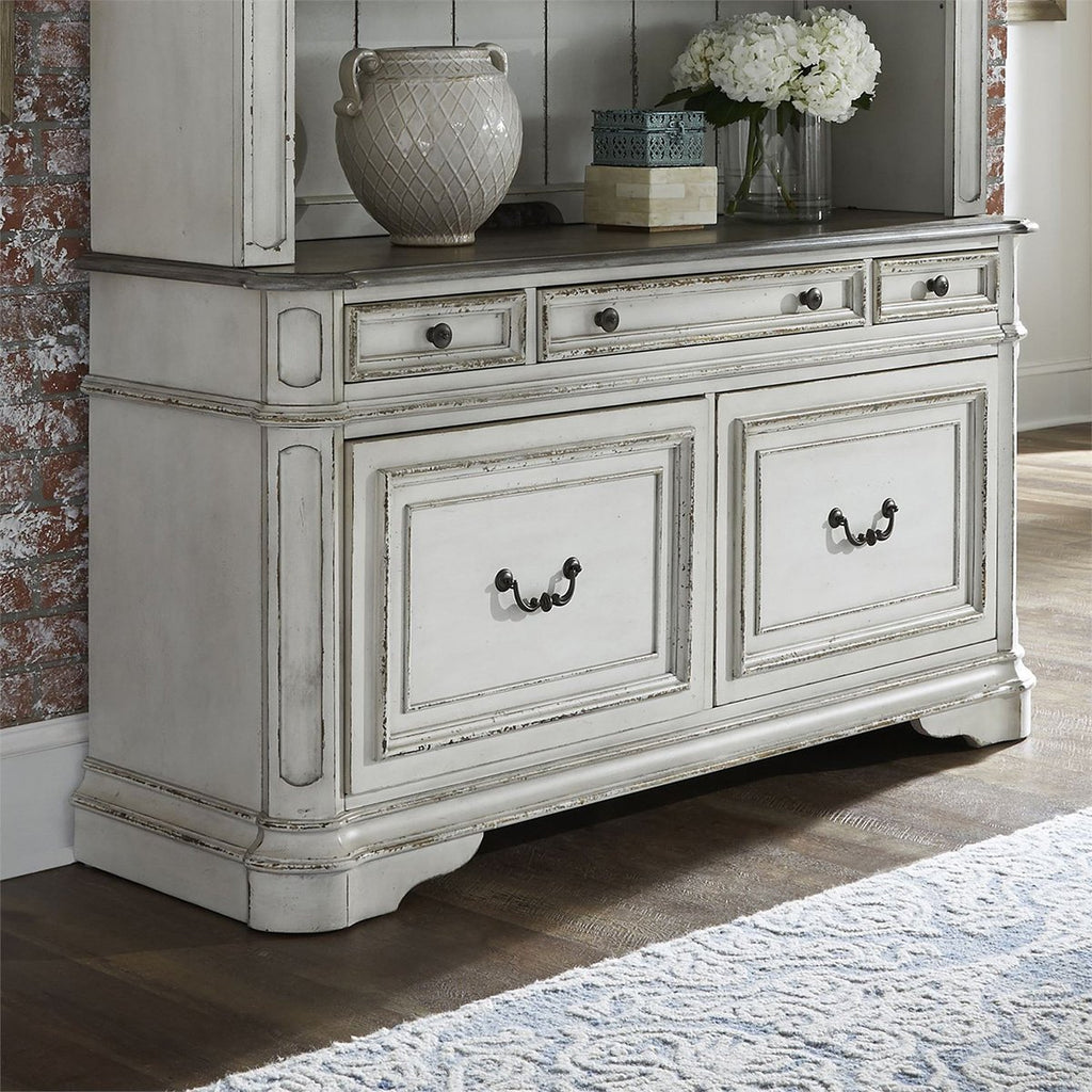 Liberty Magnolia Manor Credenza in Antique White 244-HO121. Blending of European influences makes Magnolia Manor a truly unique style for any living space. Warm antique finishes and artistic distressing along with grand scale a group to be passed to generations.