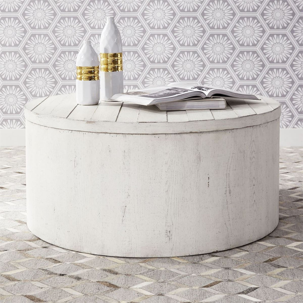 Liberty Modern Farmhouse Drum Cocktail Table in Flea Market White 406W-OT1011. Farmhouse has become a movement for today's generation- a movement that is less about the farm and more about the home and the furnishings in it. Inviting and inspirational, the farmhouse look is a design style that works for cottage or contemporary and is more about creating a look that we love. The Modern Farmhouse collection features simple clean lines that will create a timeless style, giving you the ability to mix new and older pieces together with a layering effect. A neutral palette of finishes mixed with organic new materials give a textural element to the Modern Farmhouse group.