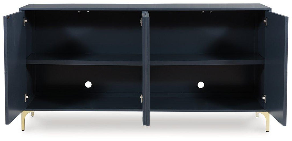 Elevate your aesthetic with the chic design of this accent cabinet. Sleek goldtone legs and striking doors with a geometric pattern infuse contemporary flair wherever you place this piece. Add a dark blue finish, and you've got a stunning showstopper. Providing function to form, the cabinet's push magnetic doors reveal two shelves and openings for electronics.