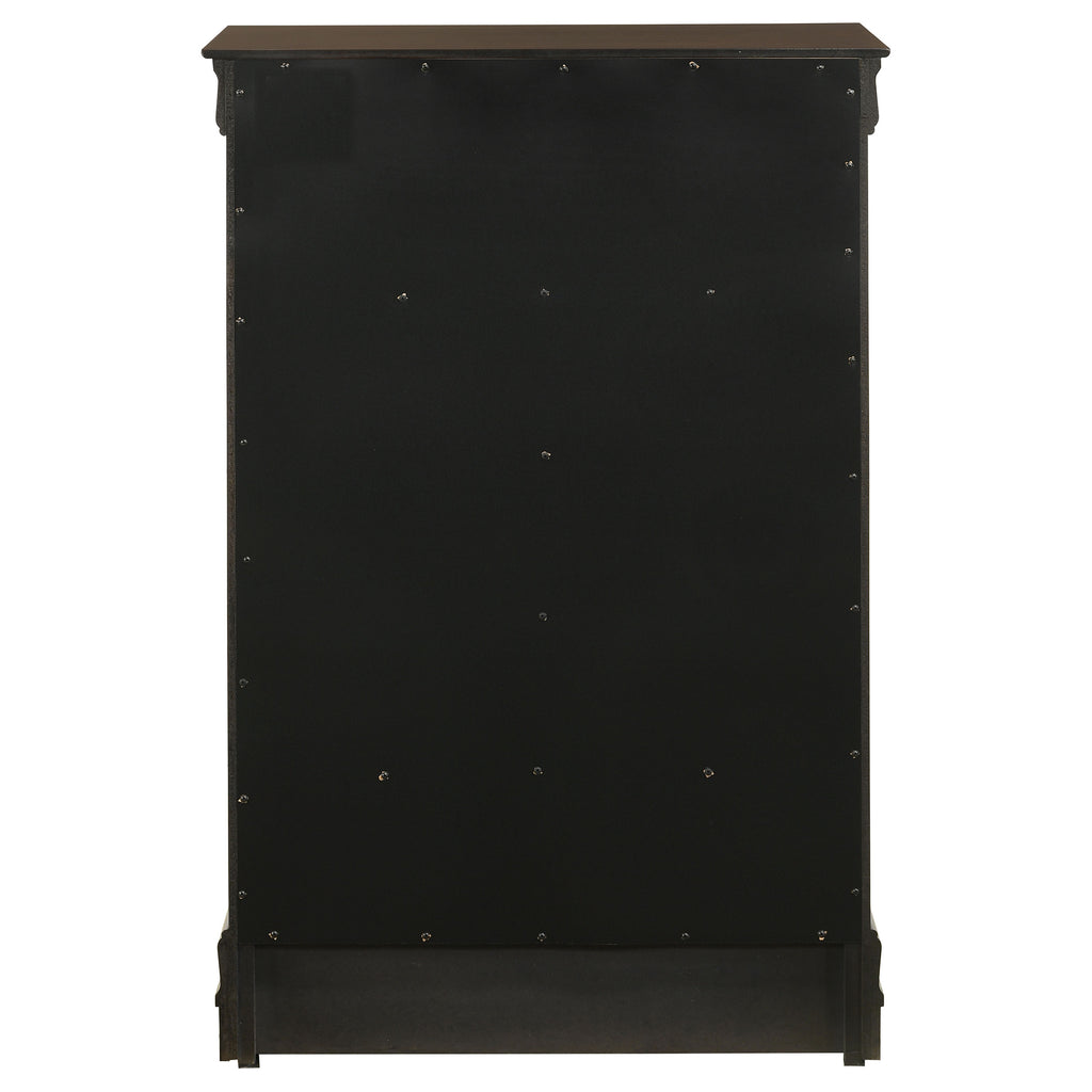 Add depth to a traditional decor scheme with this five-drawer chest. Simple and elongated, the silhouette features wood veneer and select hardwoods. Radiate classic style and sophistication with a warm cappuccino finish. Contrasting nickel bail drawer handles are a modern upgrade. The English dovetail construction provides structure that is perfect for storing linens and extra clothing.