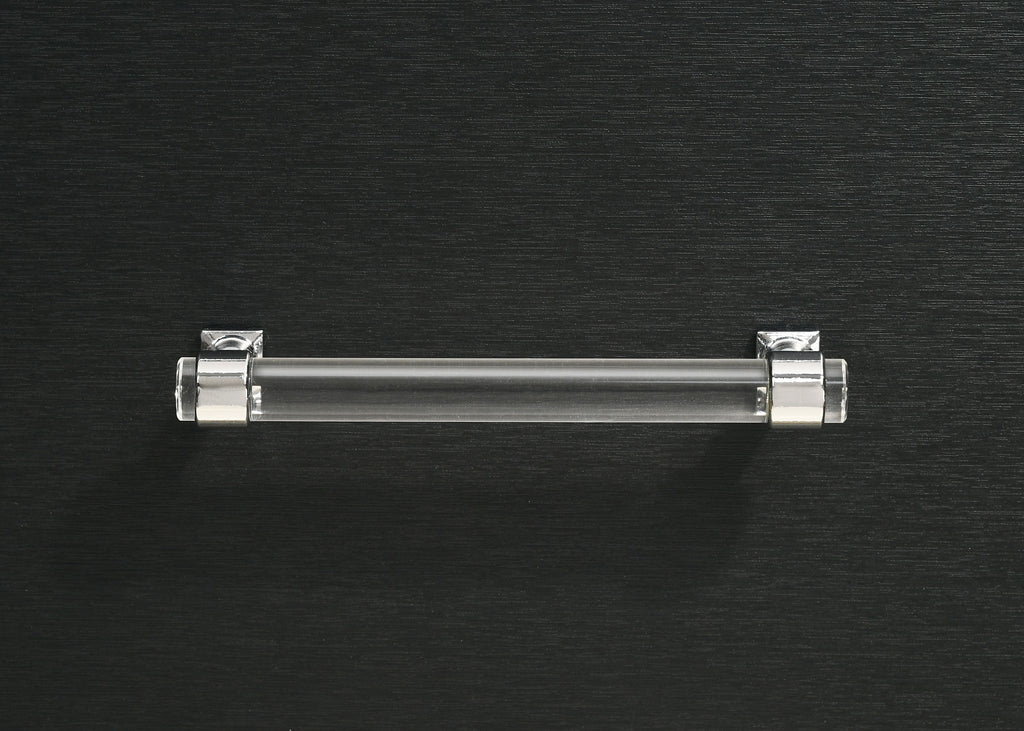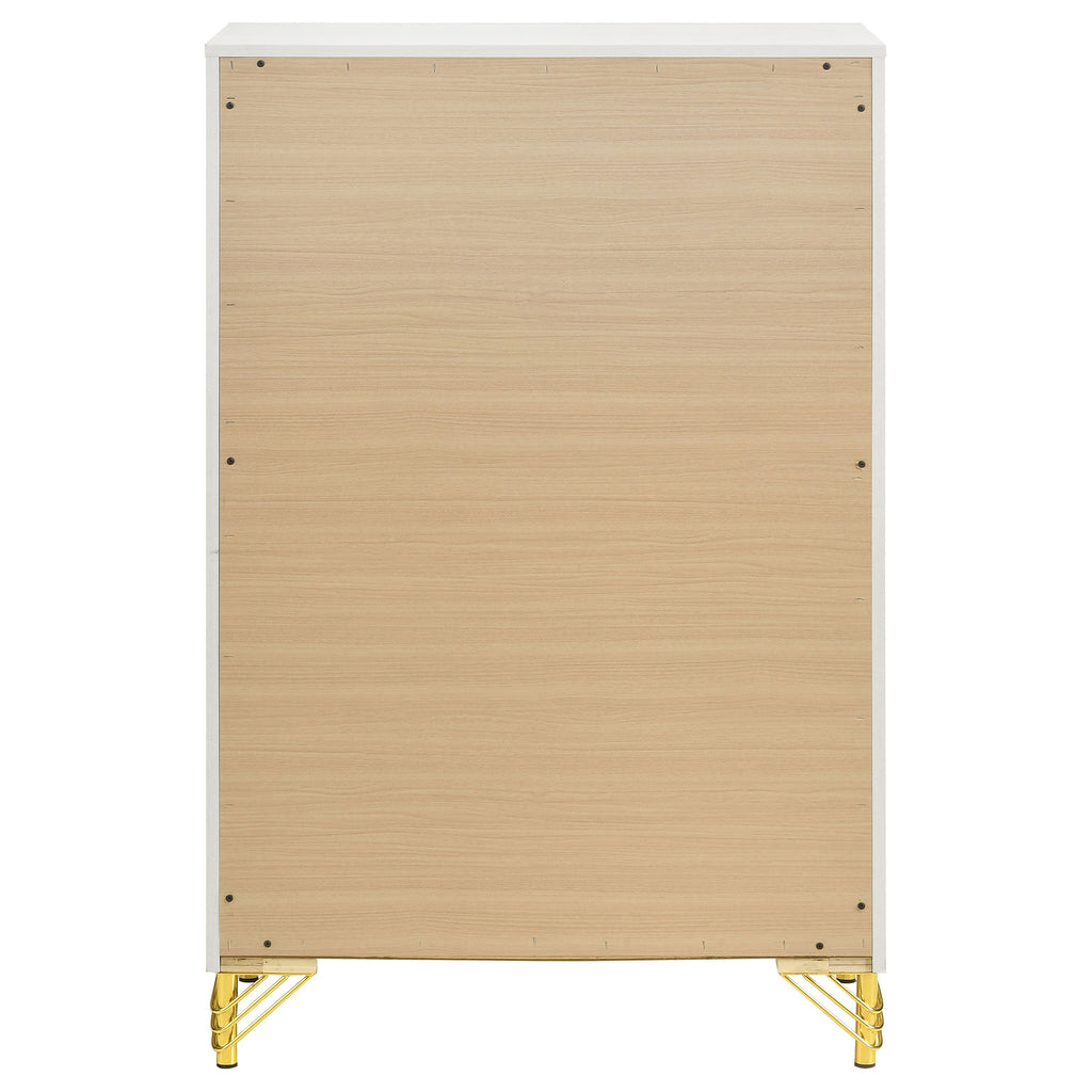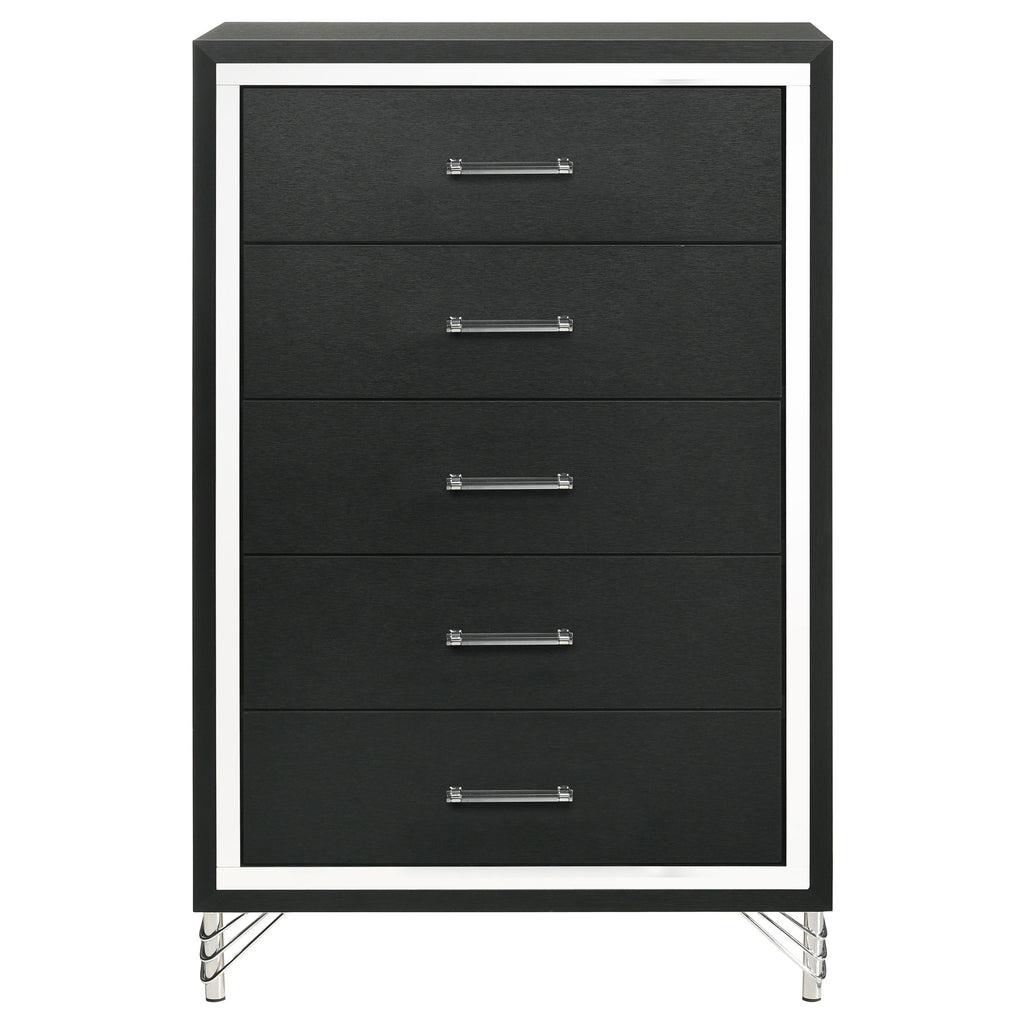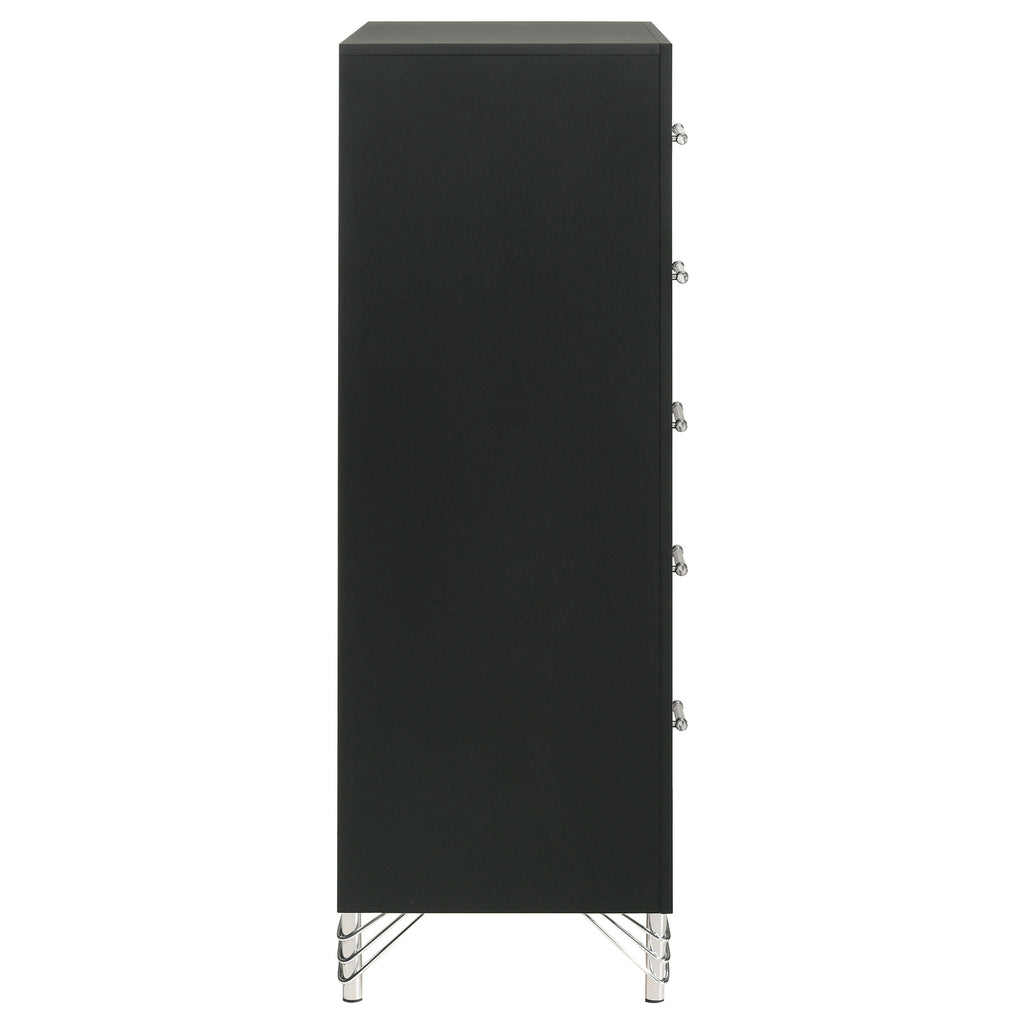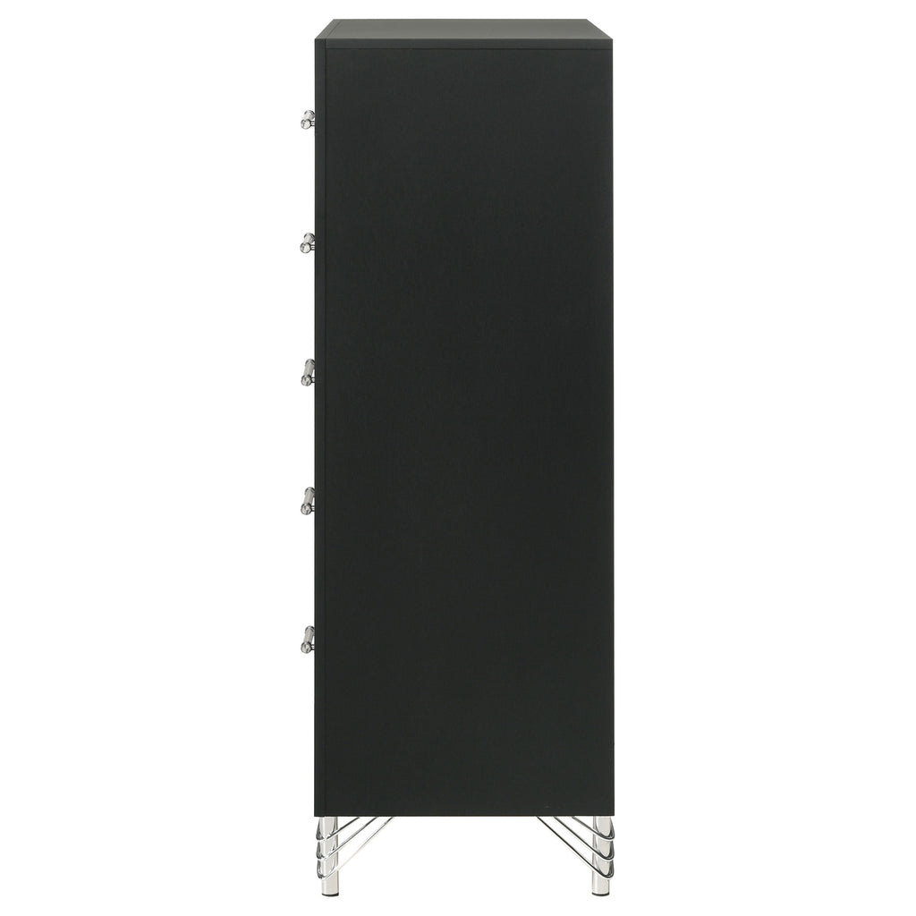 Inspired vintage touches create a refined sensibility for a modern five-drawer chest. Its tall, compact profile is ideal for a dressing area, offering plenty of storage with five roomy drawers that host everything from clothing and accessories to linens and other personal effects. The chest shows off a bold black finish, complete with gleaming chrome trim that adds coolness and elegance. Its long bar drawer pulls add character, while hair pin inspired legs bring retro glamour and sophistication. Add decor to the top for a personal touch in your bedroom. Key Features: • Chic touches bring glamour and elegant flair to a modern five-drawer chest • Bold black finish is crisp and clean in a sophisticated bedroom setting • Cool gleaming chrome finish trim highlights the front of the case, long bar pulls and decorative legs • Drawers add abundant storage for clothing and accessories to help keep a tidy bedroom • Drawers includes English dovetail joinery that ensures utmost quality of construction
