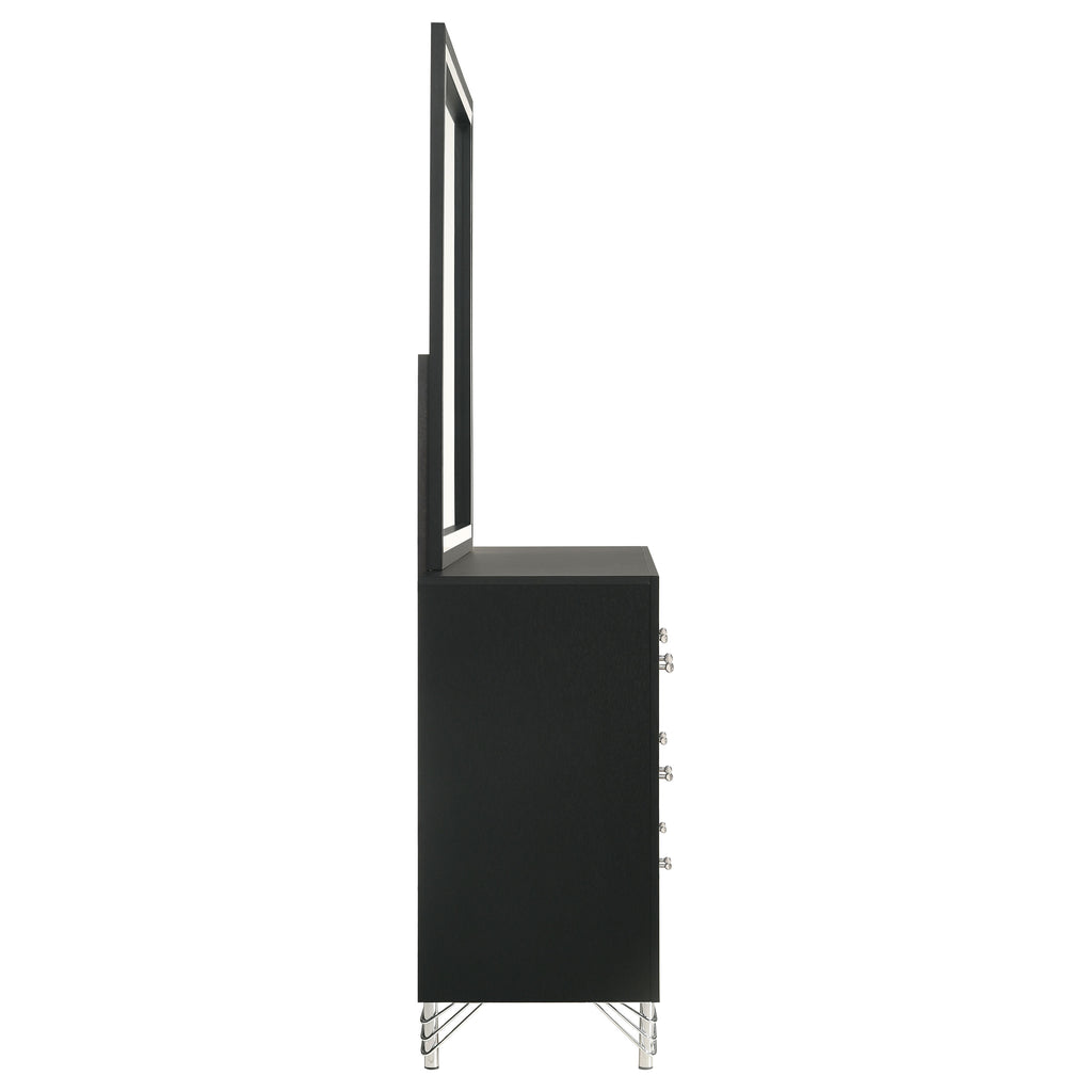 Introduce sophisticated and a hint of glamour with a modern six-drawer dresser and mirror set. Perfect for your stylish bedroom, it offers roomy drawers with smooth interiors perfect for clothing and accessories. The dresser features a bold black finish, with bands of shiny chrome trim and matching hardware and legs. The mirror on top is framed to match the front of the case, creating a sense of cohesion and richness in your dressing area. Decorative legs add a glam touch while the wide top is ideal as a vanity or for decor. Key Features: • Glam flair infuses a modern six-drawer dresser and mirror set to offer a bright, bold addition in any bedroom • Six spacious drawers create plenty of space to organize clothing, accessories and linens • Glossy chrome finish trim complements matching bar pulls and decorative legs to bring gleaming warmth • Included mirror features non-beveled glass and felt lining for a polished finishing touch • Melamine veneer is design for durability, with a white finish that's crisp and clean