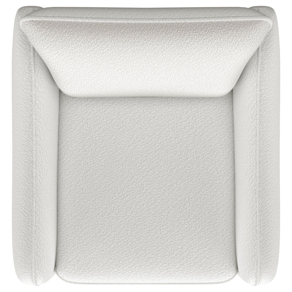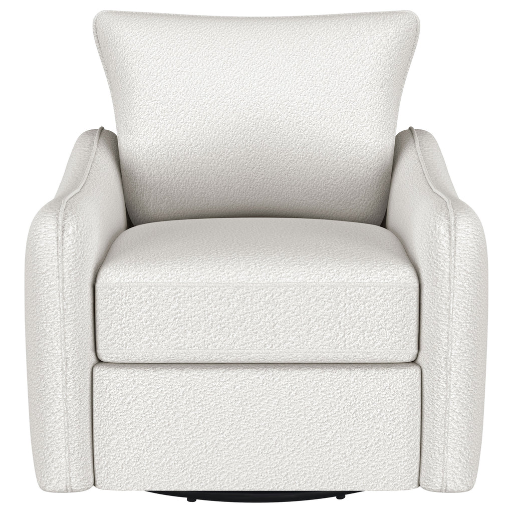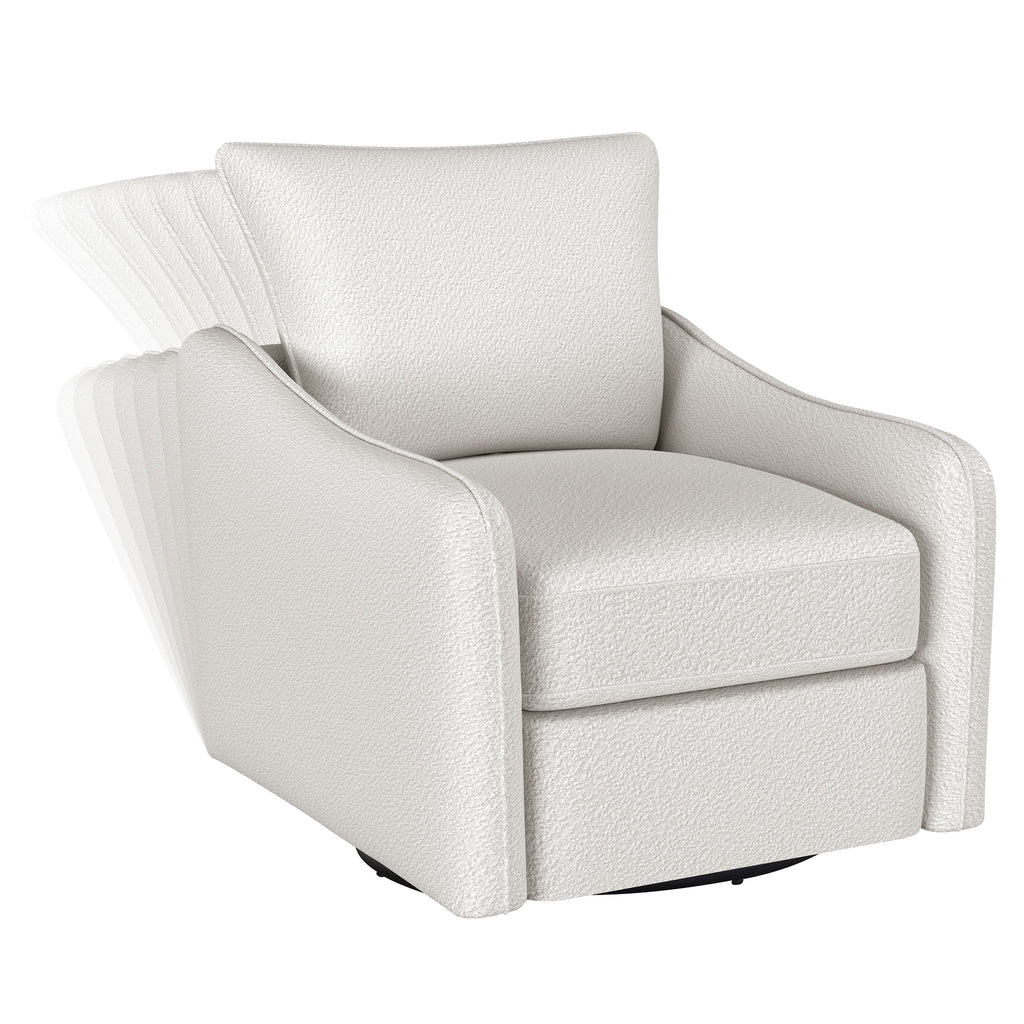 Nestled within the soft embrace of this bouclé upholstered chair, one finds a moment of tranquility. Its harmonious 360 swivel and glider functionality make each movement a fluid dance, a gentle invitation to unwind. The meticulously shaped arms, a testament to refined style, offer a restful perch for weary elbows. As the day's light fades, this chair becomes a cherished haven, its silhouette a blend of comfort and contemporary charm. In this cozy nook, time slows, and serenity takes a seat.