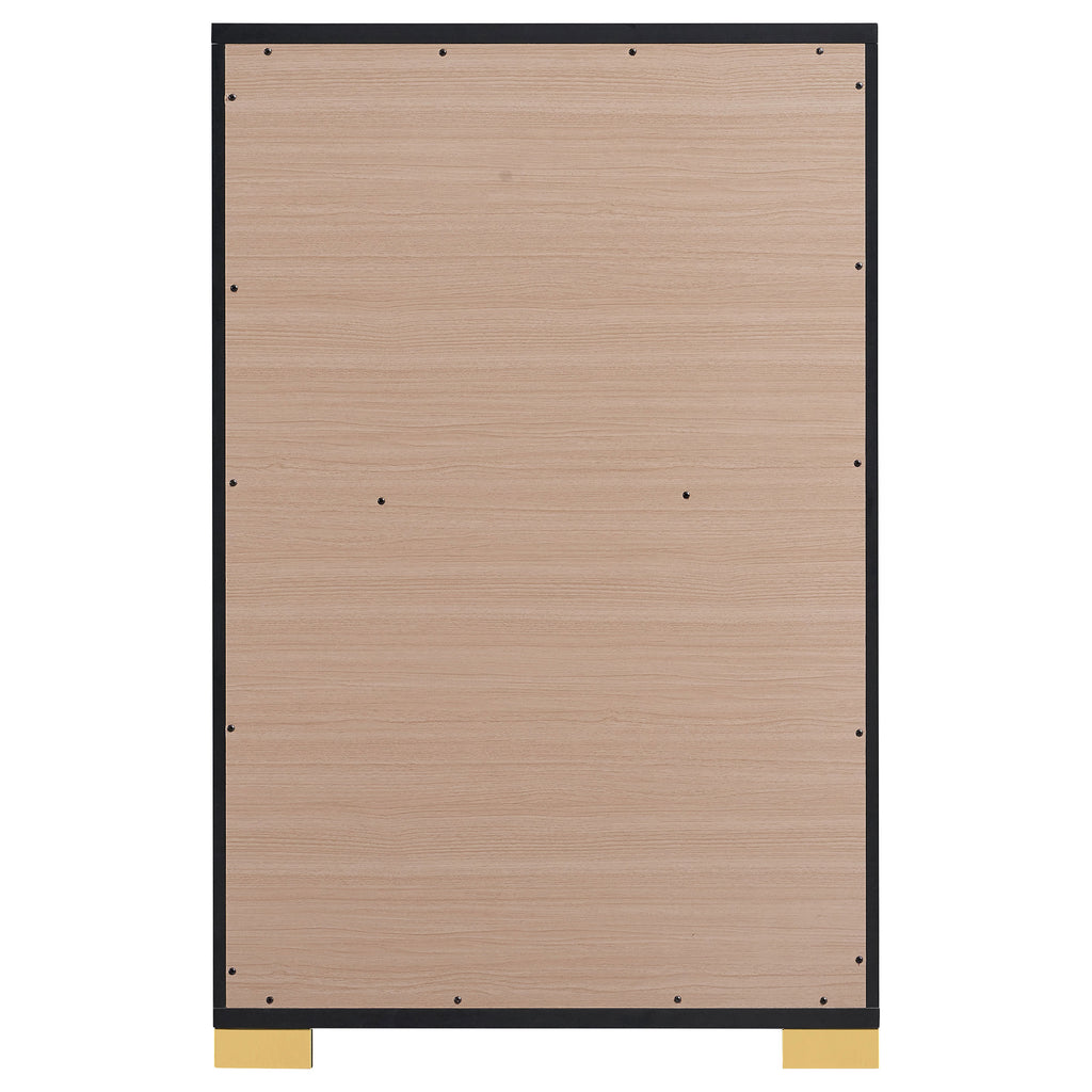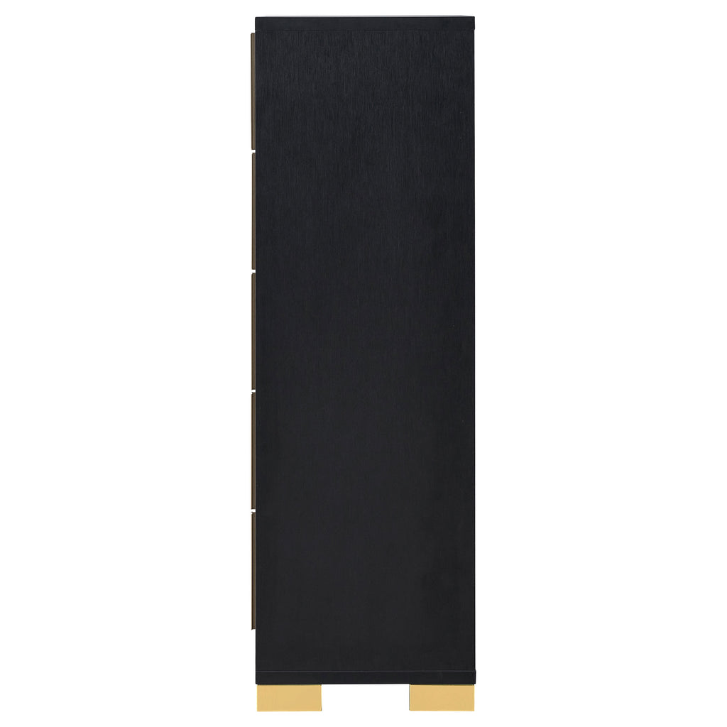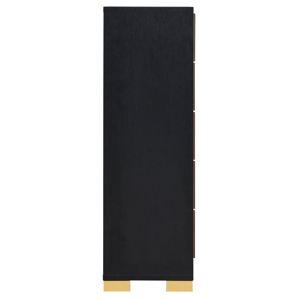 Minimalism never looked so elegant as it does in this elegant five-drawer chest, an excellent option for your updated bedroom ensemble. Modern design details produce a chic vertical chest with an Art Deco vibe and tons of storage space. Made of wood products, this five-drawer chest features a versatile finish with accenting from gold finish metal, placed carefully to emphasize a geometric linear effect. Store incidentals and accessories in drawers operating smoothly on center metal glides. English dovetail drawer construction embellishes this chest’s quality, as vertical gold metal drawer hardware offers a unique impact. Key Features: • Elegant five-drawer chest with modern design details and Art Deco vibe • Made of wood products with versatile finish and gold finish metal accents • Smoothly operating drawers on center metal glides with English dovetail drawer construction • Vertical gold metal drawer hardware for unique impact • Minimalist design with ample storage space