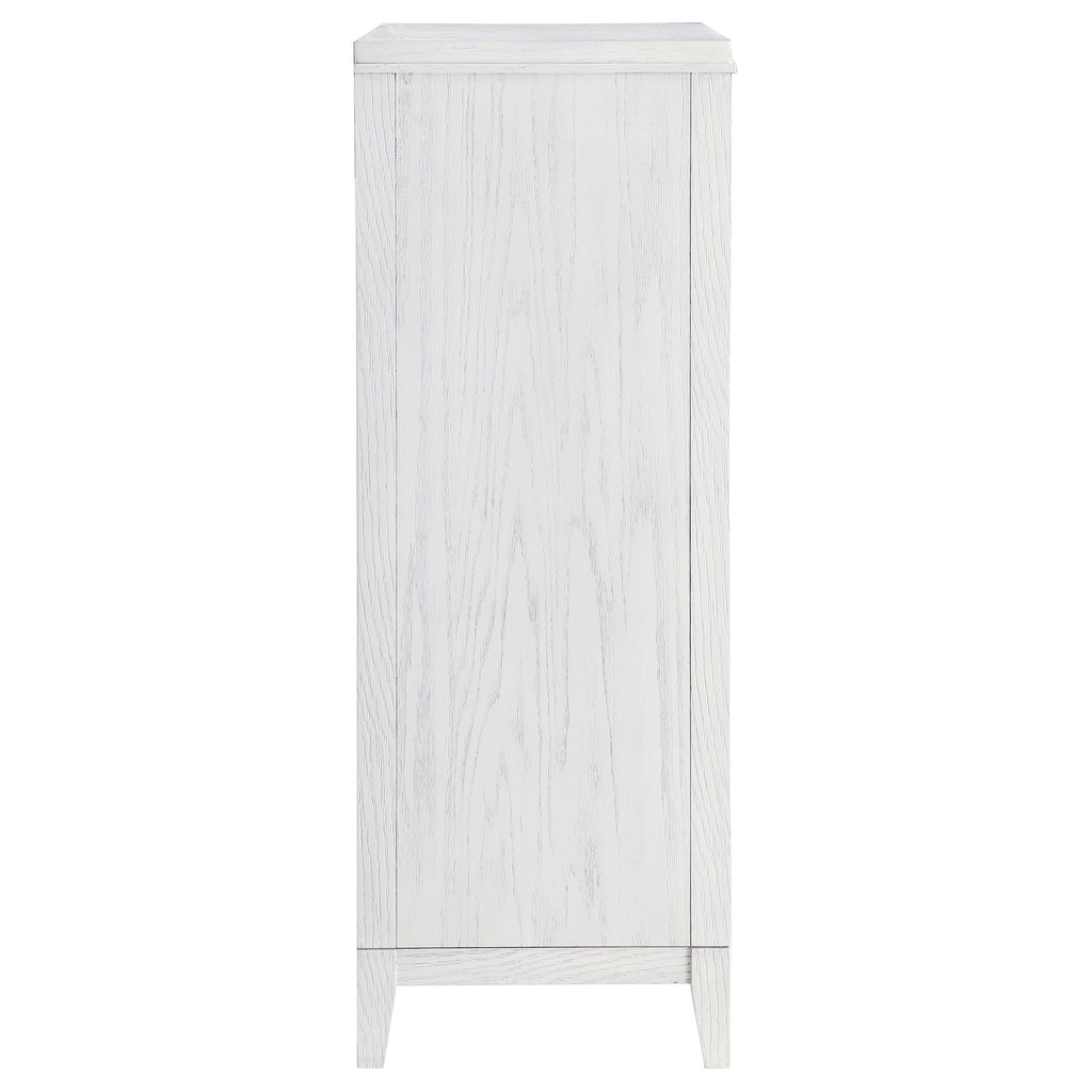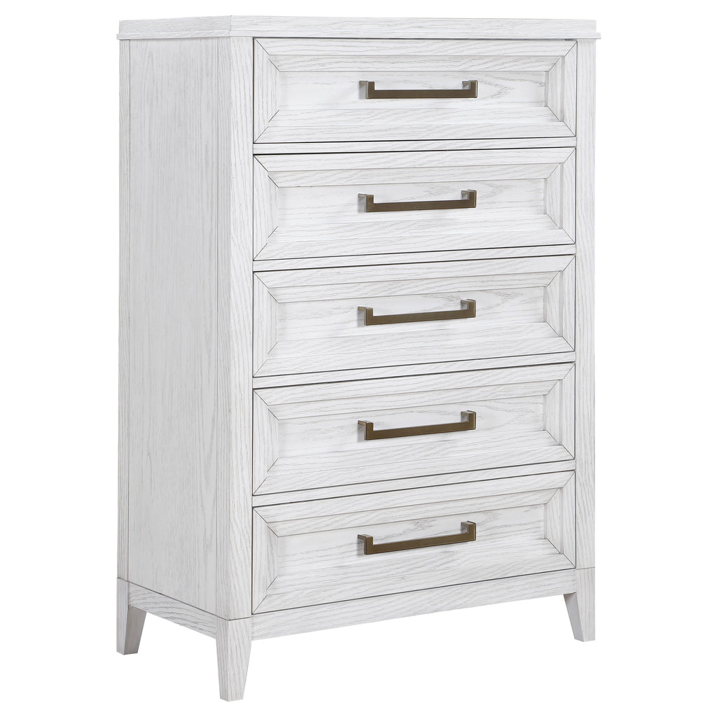 Add easy storage and inviting style to your bedroom with a modern five-drawer chest. It's tall, compact silhouette conserves space while adding welcome storage and organization. The chest features a distressed white finish to highlight wood grain details for a fresh, organic effect in your bedroom. Antique brass-toned bar pulls add contrast and definition on trimmed drawer fronts, creating inviting texture and depth. Tapered legs finish off this inviting look and a tip over restraint is included for added safety. Key Features: • A modern five-drawer storage chest offers a clean-lined silhouette and lots of storage • Distressed white finish highlights wood grain details and bar hardware to create texture and depth • Bar-style drawer pulls have a slight U-profile and a antique brass-toned finish that adds contrast • Dresser includes six drawers of equal size, perfect for clothing, accessories and even linens • Tip over restraints are included to add safety and peace of mind to this stylish set
