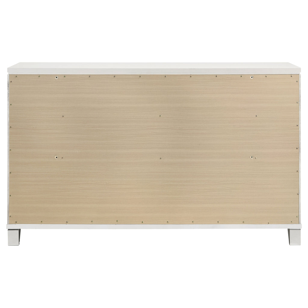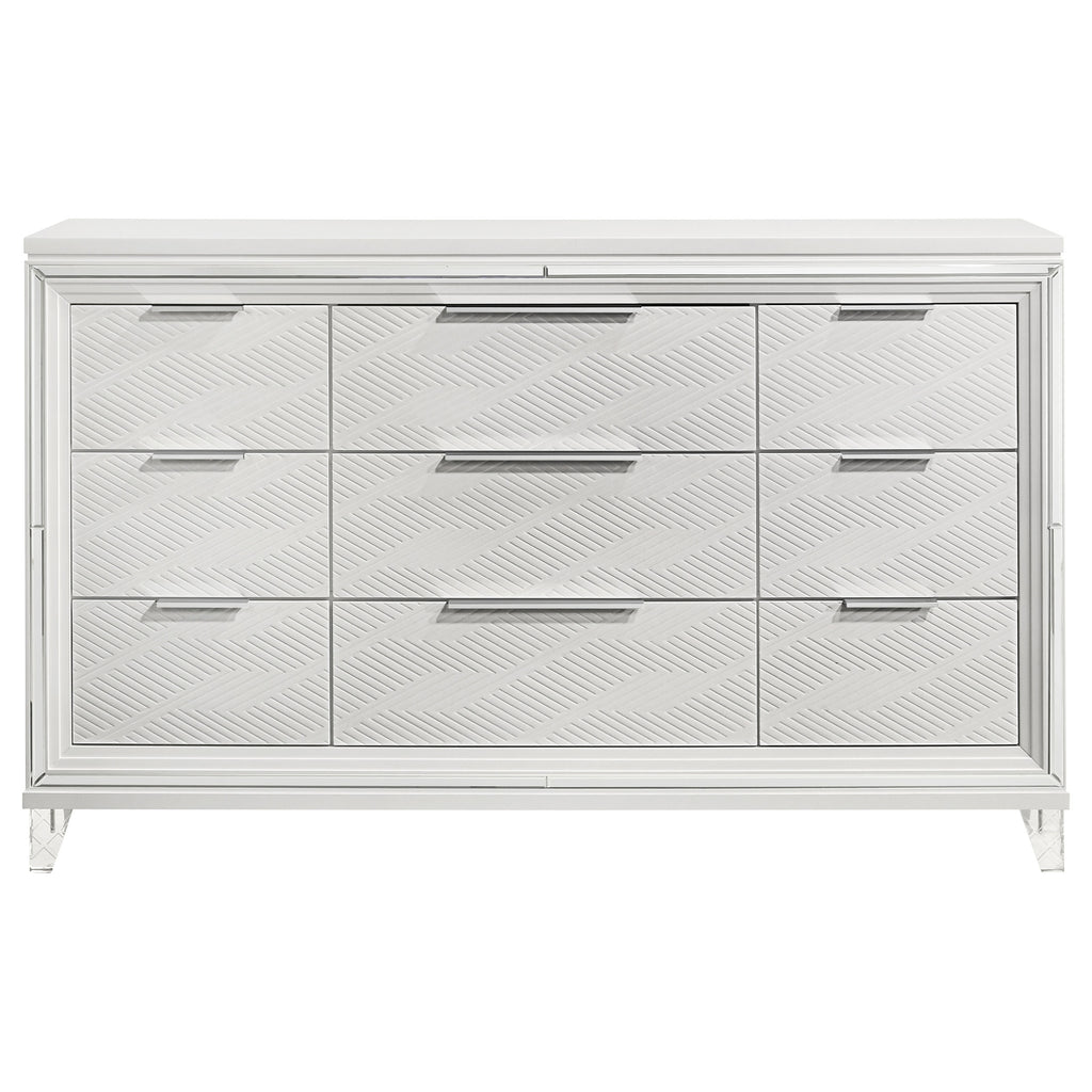 Add a touch of elegance to your bedroom with this spacious 9-drawer dresser, featuring a modern Italian design. The white finish, combined with picture framed recessed panels and embossed herringbone graphic patterns, creates a sophisticated look. Accented with mirror framing, acrylic legs, and polished chrome metal hardware, this dresser offers ample storage space. The top center drawer includes a removable jewelry tray, and all top drawers are felt-lined for added luxury. Crafted from Asian hardwood, MDF, and mirror, this dresser combines style and practicality.
