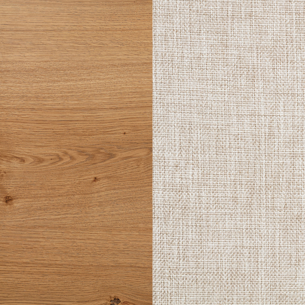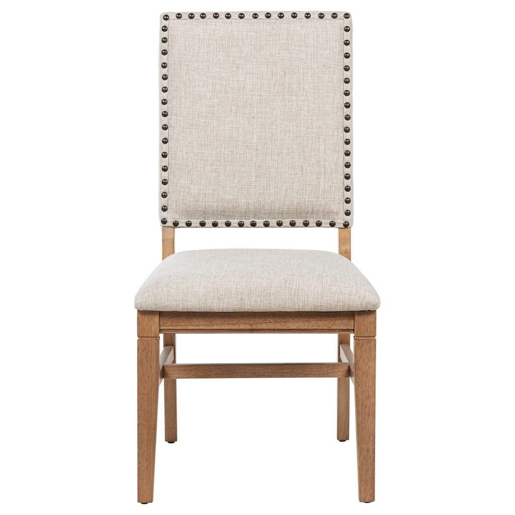 This refined dining side chair enhances any mealtime experience with subtle elegance. Upholstered in beige fabric, it features individually hand-driven black nailhead trim for artisanal detail. Crafted with a solid hardwood frame and legs in a natural brown finish, it combines style, stability, and comfort. Perfectly complementing a range of dining tables, this versatile chair creates a warm, inviting atmosphere.