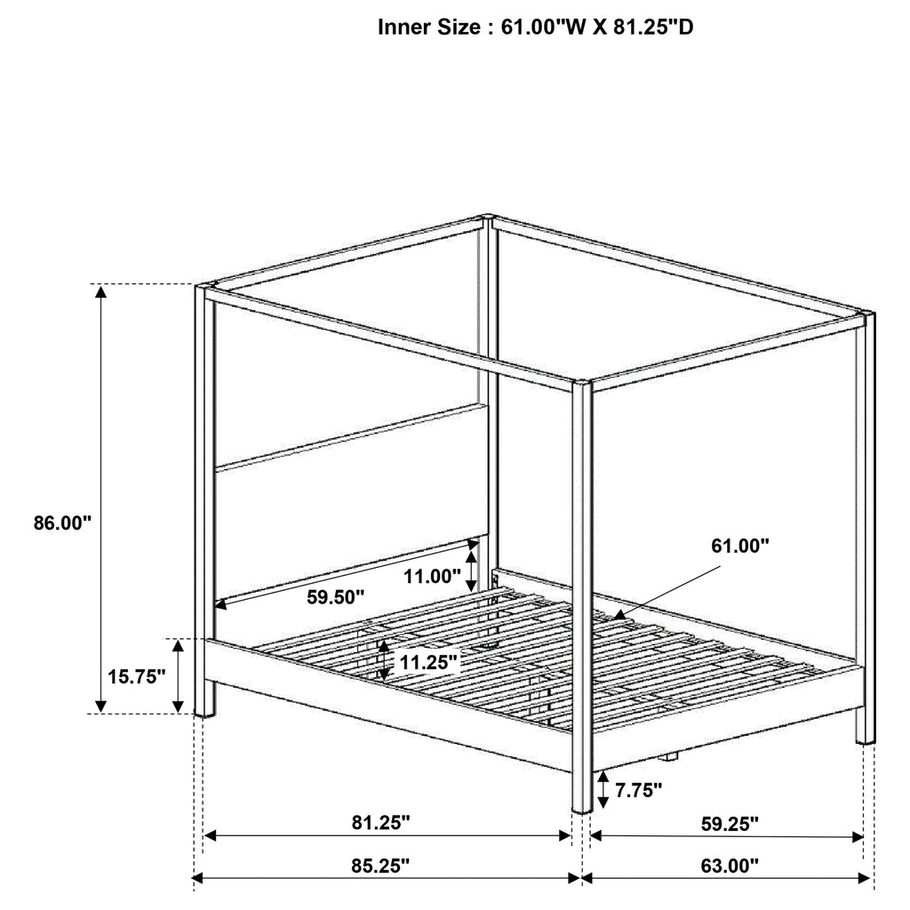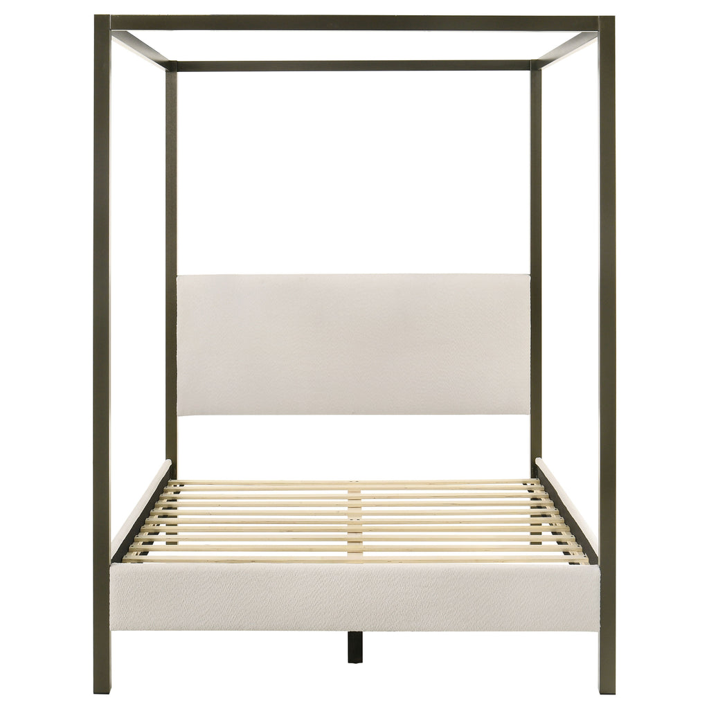 Bring refined style and character to your bedroom with this contemporary canopy bed. Designed as an instant focal point, it features a clean-lined silhouette with a padded headboard and rails upholstered in soft vanilla boucle fabric for a warm, inviting touch. A four-post metal frame in a bronze powder-coated finish adds height and depth, seamlessly blending modern and traditional elements. The platform bed includes wooden slats and three center support legs, ensuring lasting strength and stability for restful nights. Key Features: • Contemporary canopy bed with a clean-lined and structured silhouette • Headboard and rails upholstered in soft vanilla boucle fabric for warmth • Sturdy metal frame in a bronze powder-coated finish for a bold contrast • Open canopy design adds height and dimension to modern interiors • Platform slat base provides mattress-ready support with no box spring needed • A refined and stylish centerpiece that blends modern and traditional styles
