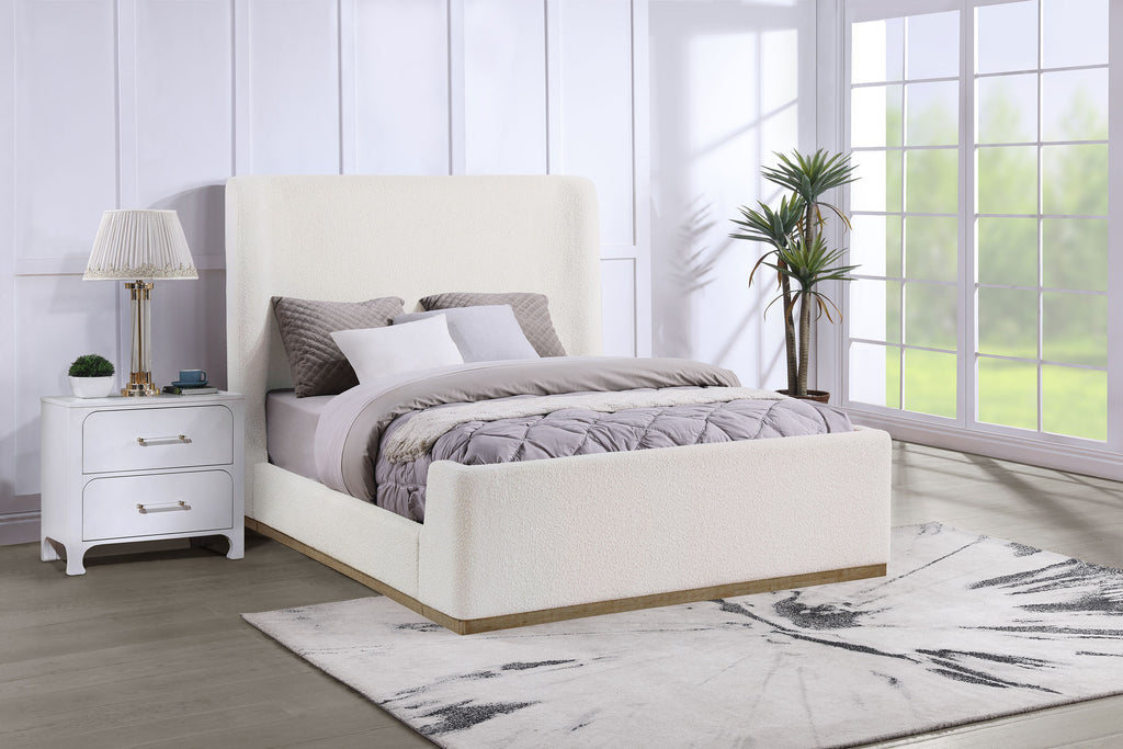 Straddling the line between modern and farmhouse, this upholstered platform bed makes a striking statement in any refined yet inviting bedroom. The tall wingback headboard and matching low footboard create a clean, grounded silhouette, while plush foam padding enhances comfort. Wrapped in soft cream boucle fabric, it delivers a cozy, on-trend texture. An exposed solid wood base in an oak finish adds warmth and contrast. Wooden slats and center support legs provide lasting stability for a restful night’s sleep.