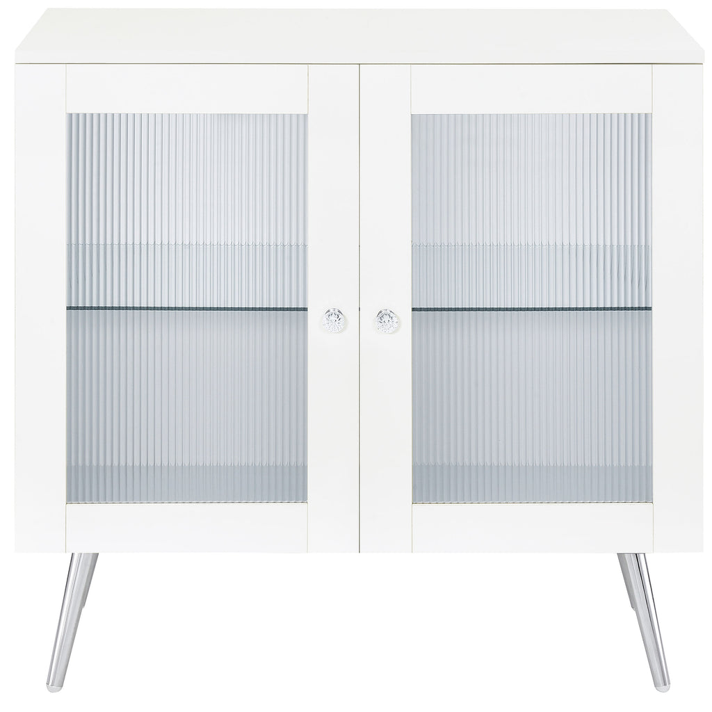 Step into a world where classic charm meets modern elegance with this 2-door accent cabinet. The crisp white finish on engineered wood construction is beautifully complemented by the textural contrast of rippled doors. Tapered steel legs, electroplated in chrome, give rise to two tiers of shelving, including a tempered glass shelf, all crowned with chic acrylic crystal knobs. This piece is not just a storage solution, but a statement that adds a touch of sophistication to any space.