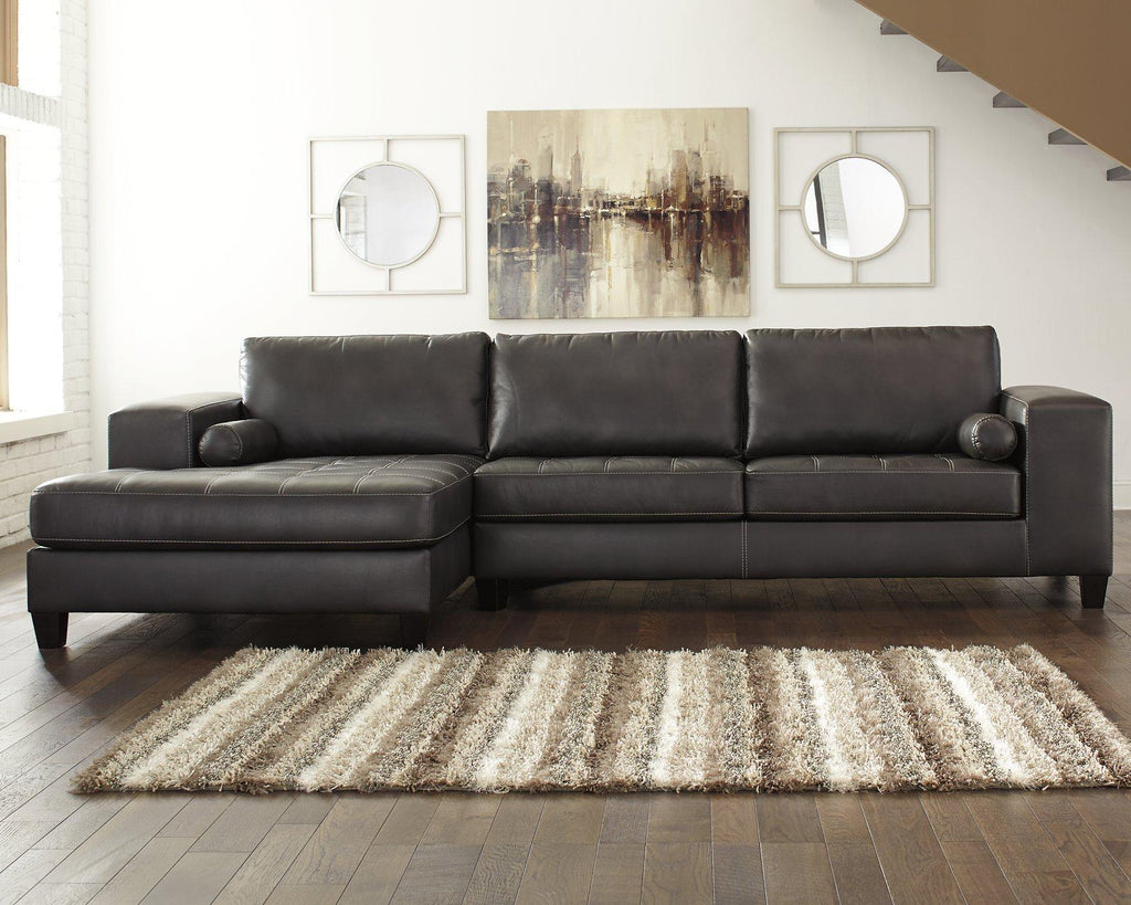 The word "plain" is not in this sectional's vocabulary. Low back seating and wide track arms make it ultra cool. Just enough soft padding in all the right places makes it handsome and sleek. Charcoal color faux leather with an embossed natural grain effect and matte finish is inspired by contemporary euro leather. Light gray stitching adds contrast, and tufting on the seats puts this set in a league of its own.