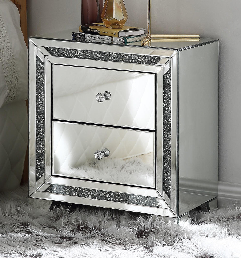 ACME Noralie Night Table, Mirrored, 22" x 14" x 26"H, 72lbs. The Noralie mirrored occasional table demonstrates sophisticated, graceful and elegant, style with unique design. This table features three storage drawers decorative drawer pull knobs. While elegantly reflecting its surroundings, combines glamour with modernism. Light is captured and reflected from all surfaces creating brightness and the illusion of space. Features: - Rectangular Occasional Table - Storage: 3 Drawers - Beveled Mirrored Finish & Faux Diamonds Inlays - Drawer Construction: Glide Side Metal, Felt-Lined Not Included, Drawer Size: Overall 13" x 11" x 7"H - Tapered Leg Materials: Mirror, Faux Diamonds, Composite Wood