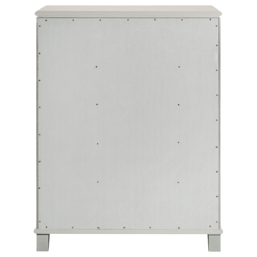 Discover elegance and functionality with this beautifully crafted chest, designed to complement your bedroom suite. The pearl white finish, highlighted by the unique diamond star drawer fronts and chrome metal pulls, exudes a contemporary charm. Acrylic feet with polished chrome caps add a touch of sophistication. Offering ample storage, this chest keeps your space organized while enhancing your room’s aesthetic. Experience the perfect blend of style and practicality with this exceptional piece.