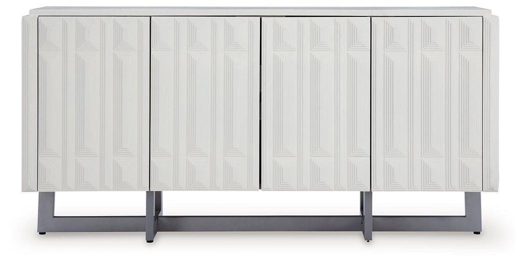 Keep things contemporary cool with the Ornawel accent cabinet. The step pattern on the door fronts lends an appealing geometric touch, with a lightly distressed white finish enriching the design. Touch latch doors open to reveal two shelves for all your storage needs. What a high-style statement.
