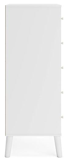 The perfect marriage of contemporary and casual style, this chest of drawers is a charming addition to your home. It's expressive with a two-tone look in a solid matte white finish and a replicated sugarberry wood grain pattern. Ball-bearing glides offer smooth opening and closing of the drawers, while white knobs and splay legs add a finishing touch.