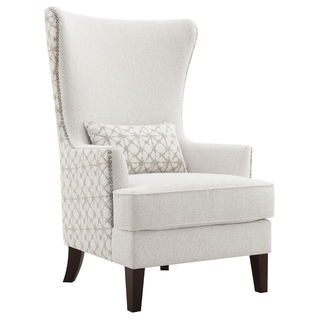 A haven for relaxation, this tasteful accent chair is also a source of inspired beauty, perfect for your semi-formal living area. Sit in supreme comfort on a chair with a frame built of various woods as artisan design elements include an ultra-high wing back with gentle contouring, abbreviated track arms, and a removable T-cushion with polyester filling creating extra support. Geometric patterning accents its gray boucle fabric upholstery in key places, and a welt trim kidney shaped pillow provides extra comfort. Deep brown finish wood legs form curvy silhouetting. Charming silver nail head trim completes a chic package of features for a must-have chair.