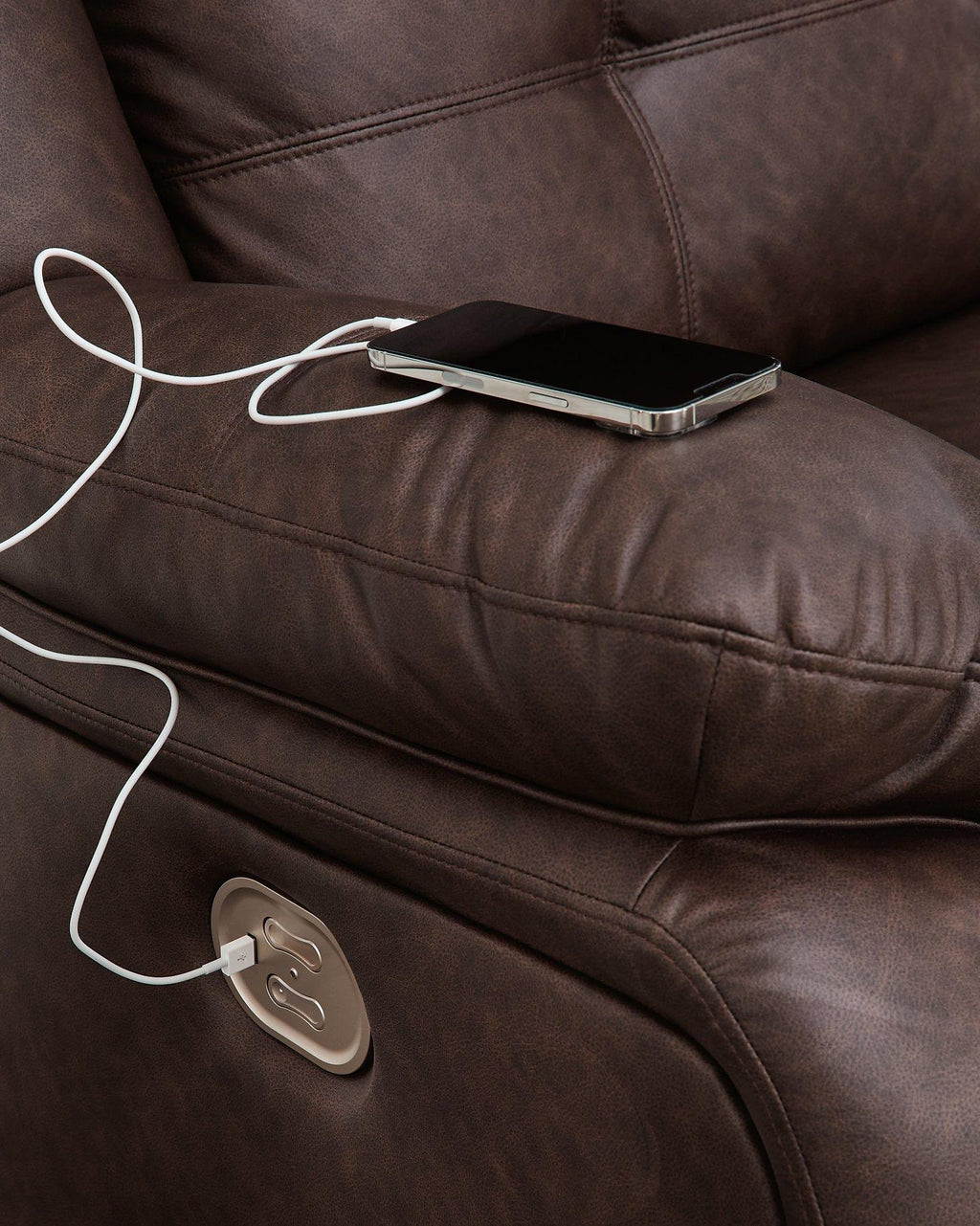 Elevate the everyday with the Punch Up power reclining sectional loveseat. With easy one-touch reclining and spacious seating, this piece offers relaxation and unparalleled coziness. Its faux leather upholstery is comfortably practical and beautifully enhanced with stylish contrast stitching. Factor in ample padded arms and a tufted lumbar area and you’ve got the perfect spot to wind down.