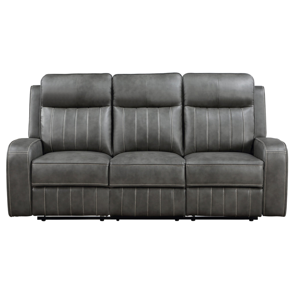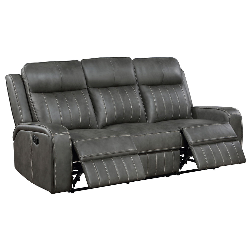 Merging the classic style of both contemporary and transitional design schemes, the motion sofa creates a dreamy venue for relaxing and entertaining. Choose a pleasing motion sofa covered in smooth grey leatherette upholstery with vertical topstitching adding decorative elements and a dimensional impact. This sofa features foam padding on its frame and in-pocket coil spring seat cushions, as attached back cushions are capped with ultra-plump headrests. Recline into varying positions using a manual control function, and enjoy space efficiency with its wall-hugger design. A timeless style and luxurious comfort converge to offer a multi-functional and beautiful piece for entertaining or solo relaxation.