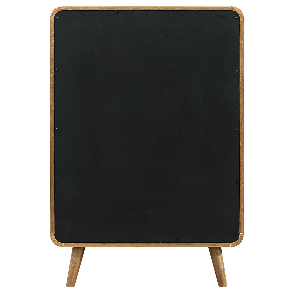 Stylishly organize your wardrobe with this mid-century modern chest of drawers, built with pine, engineered wood, and walnut veneer for durability and style. Featuring five spacious drawers, it offers ample storage for clothing and accessories. Rounded edges and tapered legs lend retro flair, while felt-lined top drawers add a touch of functionality. Smooth drawer glides and subtle metallic hardware complete this elegant storage piece.