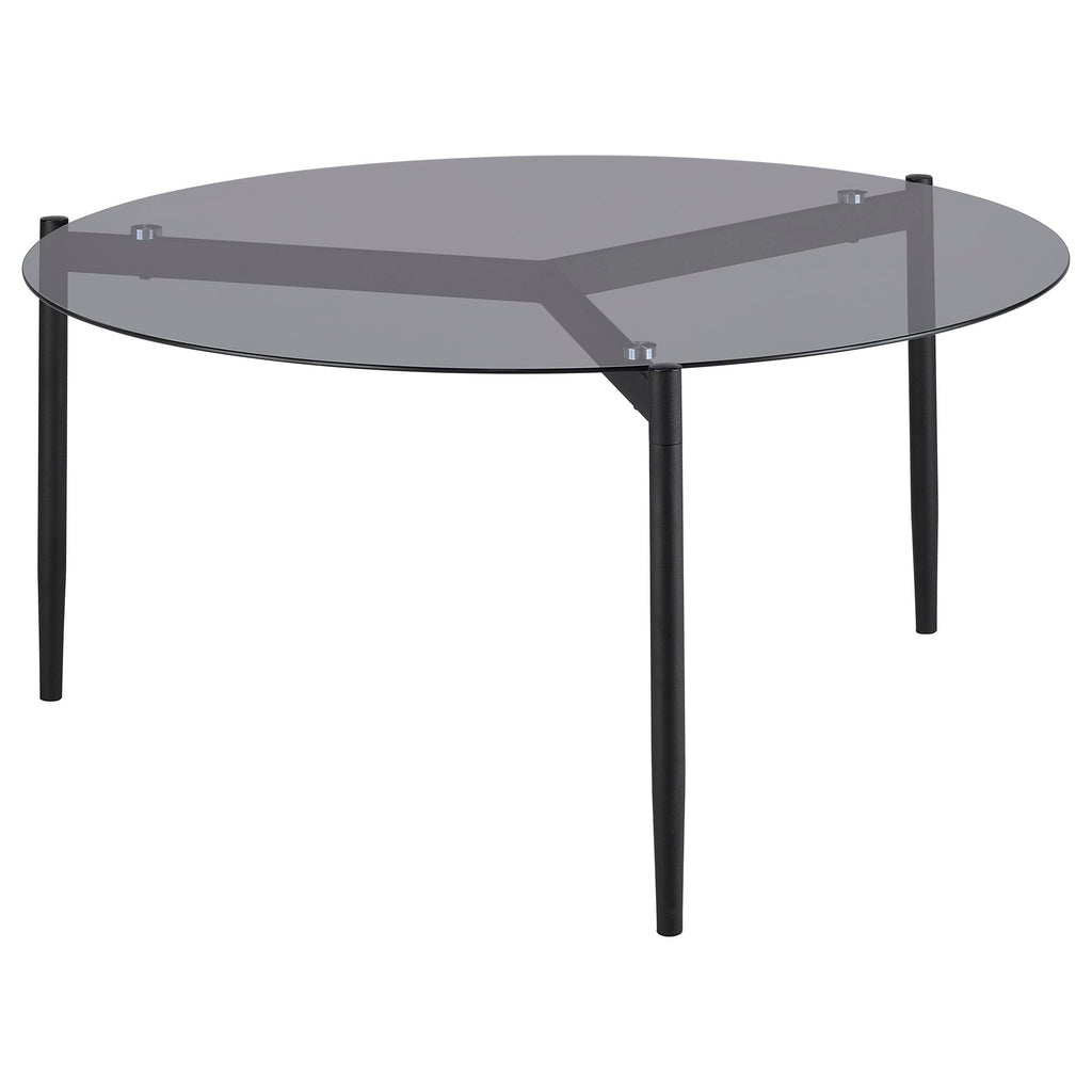 This modern coffee table features a sleek, tempered smoked glass top that adds sophistication to any space. Its sturdy metal base, finished in a black powder-coated sandy texture, provides stability and a contemporary edge. The round design creates a welcoming focal point, ideal for living room arrangements. This cocktail table combines minimalist style with durable construction, making it a perfect choice for modern and transitional interiors.