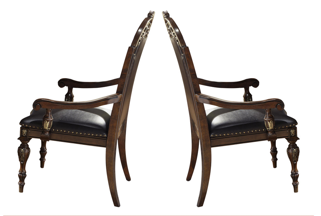 Cosmos Furniture's Rosanna traditional style Arm Chair in cherry finish wood comes as a Set of Two (2) Chairs. The graceful elegance of our Rosanna collection makes every meal a celebration. Expertly crafted of solid hardwoods and resin with selected veneers, hand-rubbed rich cherry finish. The Rosanna dining arm chair has front turned spindle legs accompanied by finely detailed ornate carvings in a brushed gold. These handsome arm chairs are upholstered in leather-like material. Chairs are sold as a set of two (2). Matching Rosanna Dining Table, more Rosanna Dining Chairs, Rosanna Dining Hutch, Rosanna Dining Buffet and Rosanna Dining Server are sold separately.