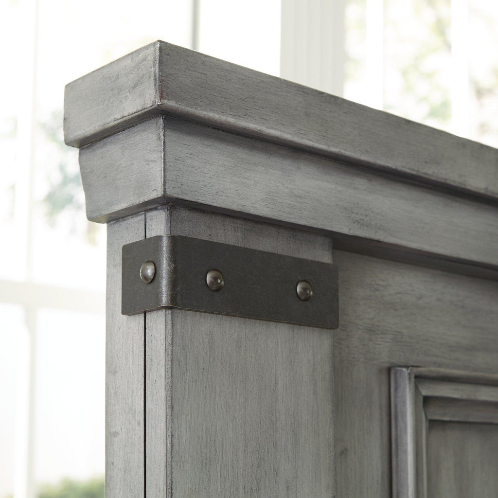 With its light weathered gray coloration, this storage bed conveys trend-right urban farmhouse style. Thick-profiled top moulding on the tall, mansion-scale headboard lends a fresh take on a timeless design. The footboard features two storage drawers with profiled frames and dovetail construction. Bar pulls and metal straps in a dark aged bronze tone add to the rustic-yet-refined aesthetic.