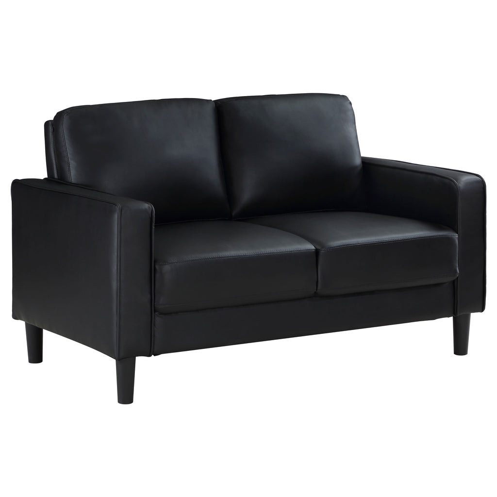 Create a stylish sense of cohesion in your living room with a modern two-piece sofa set. Infused with elegance, it features smooth faux leather upholstery over plush cushions, perfect for relaxing or entertaining. Both the sofa and loveseat feature a structured silhouette, complete with track arms and tapering legs that add a hint of height. Cushions are attached for a smooth, seamless look every day, with sinuous spring decking under seats and webbing across the back for excellent support. Neutral color sets the tone you're looking for, perfect in a curated living space.