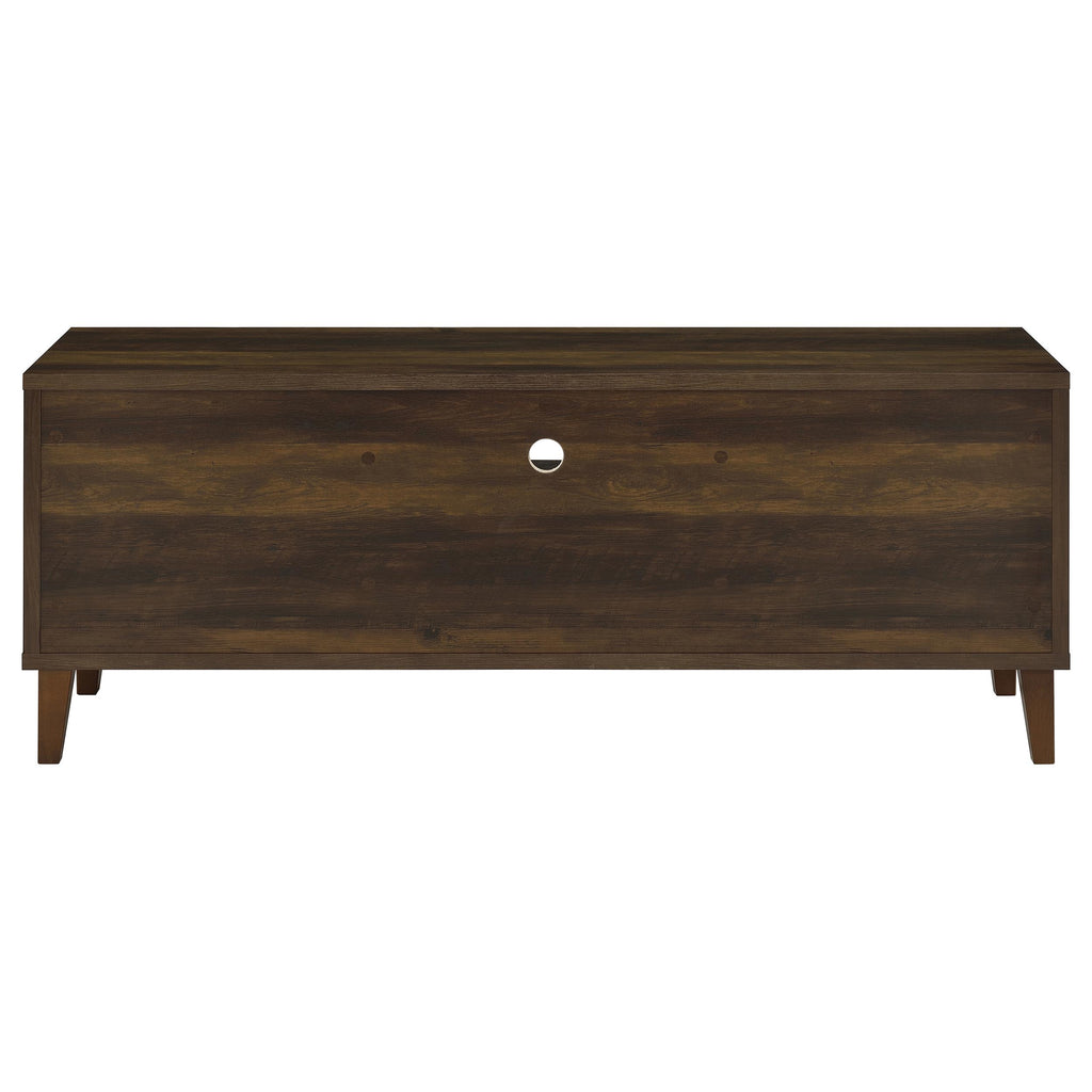 Introduce a touch of mid-century modern flair in your living room with a TV stand constructed from engineered wood and rubberwood. This media console, designed for televisions up to 65 inches, offers a dark pine wood finish over melamine, blending excellent durability with stylish appeal. The trendy slatted door fronts, adorned with black plastic pull handles, open to reveal ample storage options. Inside, you'll find open center shelving with a cord management opening and additional shelving ideal for media, games, or accessory storage. Resting on solid wood legs, this TV stand not only keeps your space tidy and organized but also provides a sturdy foundation.
