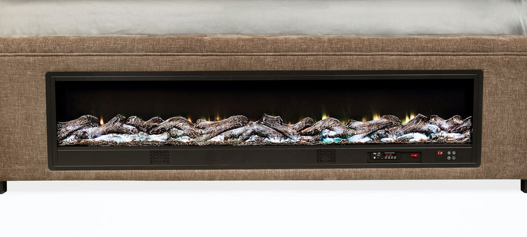 Elegance and functionality converge in this upholstered bed, designed to enhance both comfort and ambiance in your bedroom. The tufted headboard and soft fabric upholstery create a timeless, sophisticated look, while the footboard’s visual flame box insert serves as a striking centerpiece. Constructed with durable birch, plywood, and engineered wood, this bed ensures longevity and luxury. Modern features, including a built-in Bluetooth speaker and wireless remote control, add convenience and contemporary flair.